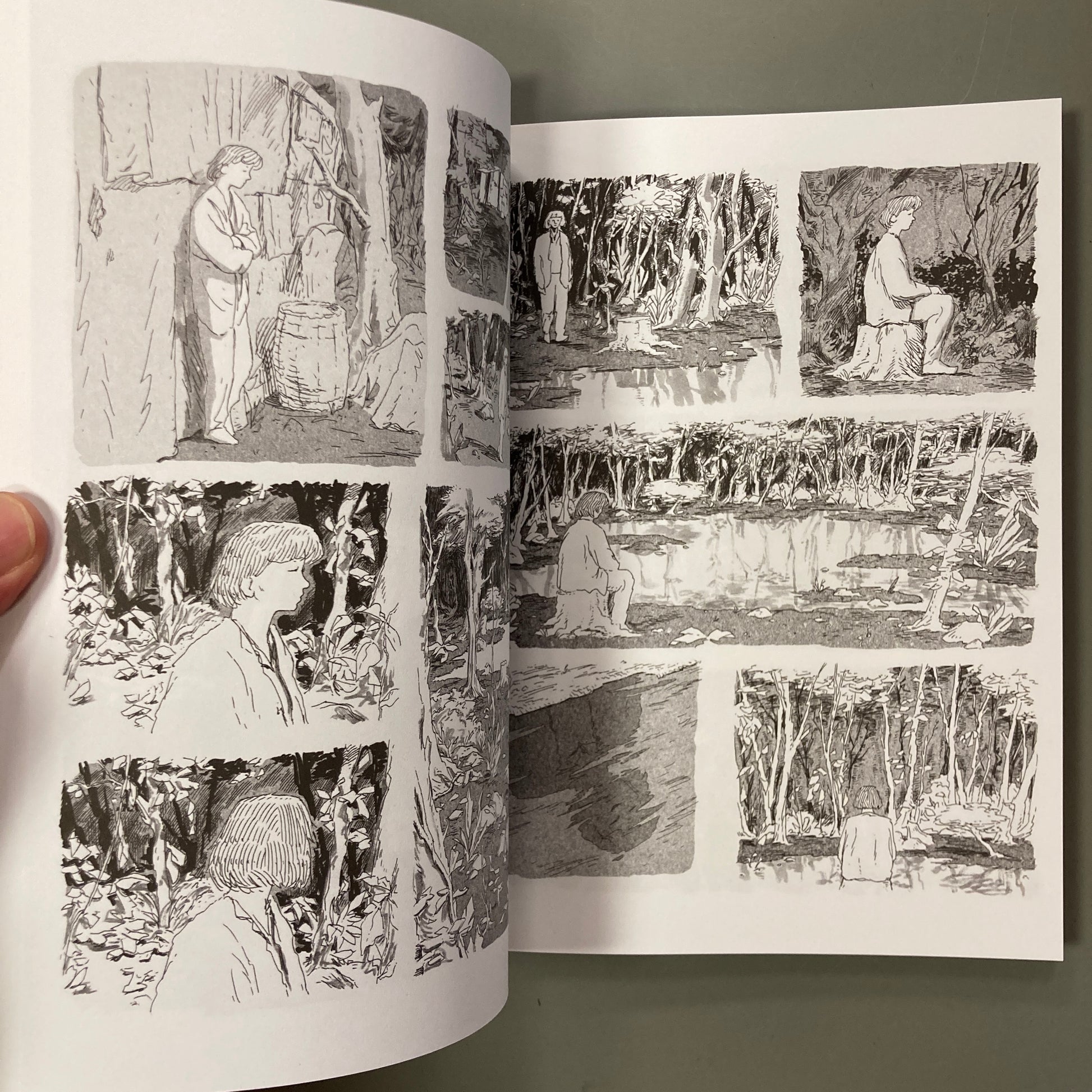 The residents of an isolated village in a dreamlike world scavenge for supplies in the surrounding forest, collecting scattered items left over from a time long past. No one strays far from this community, fearing what may lie beyond it. When they find a stack of notebooks by an unknown author, a young villager becomes obsessed with their contents. She sets out on a quest to find the writer. As she ventures into the unknown, she discovers a world both barren and increasingly complex. The closer she gets to her goal, the more she realizes that the encounter she’s been seeking probably won’t be what she wanted.