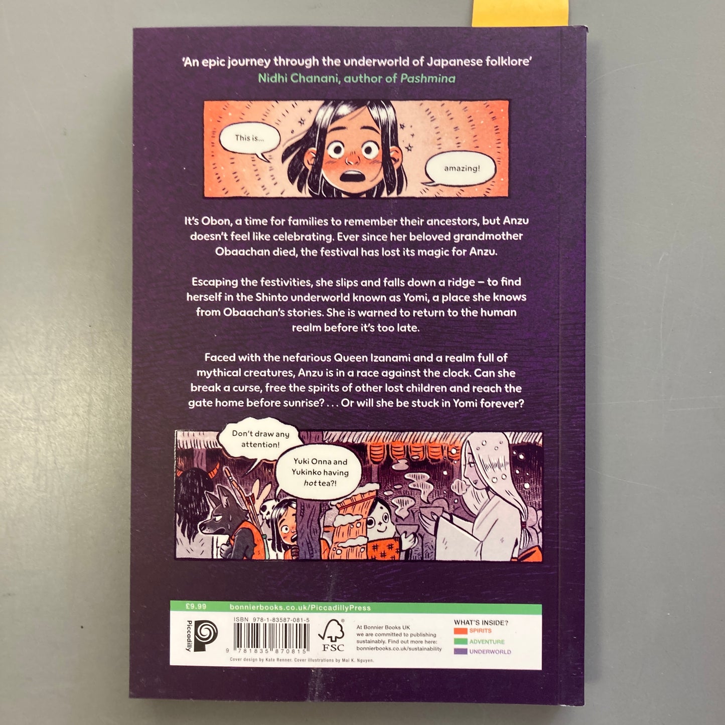 While avoiding holiday festivities, Anzu spots a stray dog down the street. A dog that seems to be staring right at her. But when she chases after it, she slips and falls down a ridge, losing consciousness. When she awakes, she’s in the Shinto underworld known as Yomi, a place she’s only heard about in Obaachan’s stories. The stray dog, she finds out, is actually the Gatekeeper of Yomi, and he warns her to return to the human realm before it’s too late.