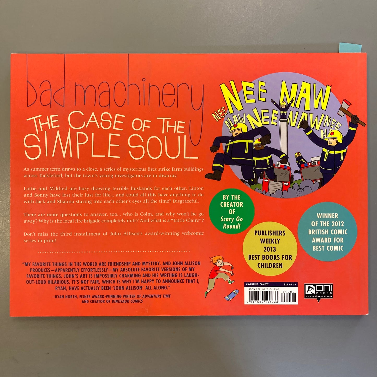 The Tackleford gang is back with a new case that demands solving! When Tackleford's derelict barns begin going up in flames, Linton and Sonny are on the case with a moderately mysterious new friend. Paths cross, however, when Lottie and Mildred meet a terrifying yet misunderstood creature living beneath a bridge! Throw in an overly enthusiastic fire brigade, a transforming skate ramp, and a new French teacher and you've got the kind of charming genius that can only be found in John Allison's BAD MACHINERY.