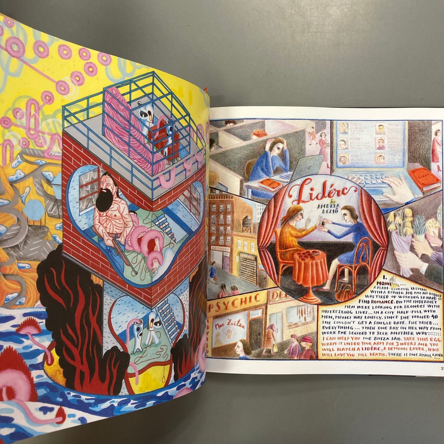 Comic book stories include: “Adolf ’s Aberration” by Nora Krug; “Dispatches from Oblivion” by Greg Clarke; “The Great Sea Serpent of Brazil’s Parahiba River” by Mark Todd; “Lidérc” by Andrea Dezso; “Visitation” by Peter Kuper; “The Vexing Thing Upstairs ” by Denis Kitchen; and “Leftovers” by Sergio Ruzzier. Plus gag cartoons by Shag! and Greg Clarke.
