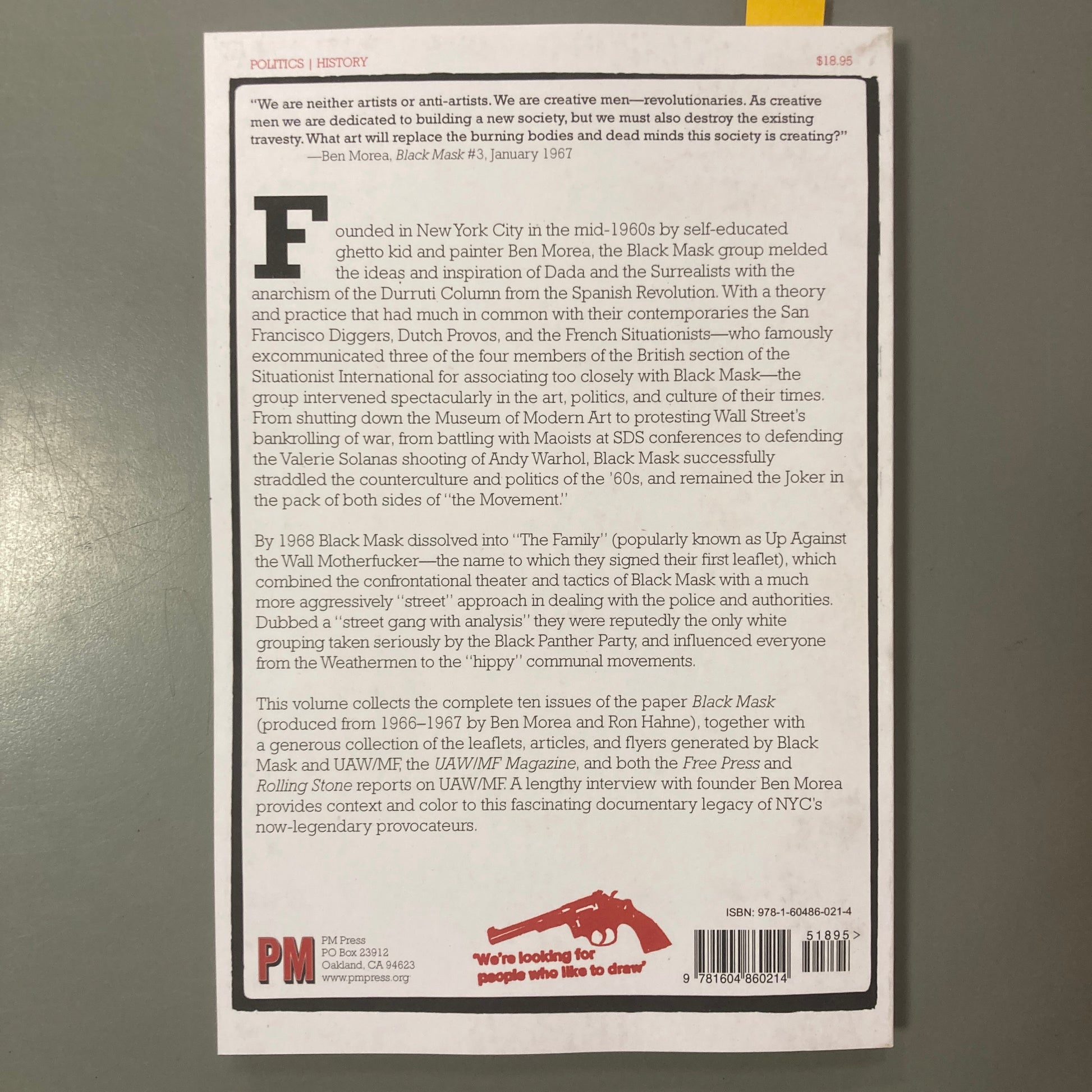 Founded in New York City in the mid-1960s by self-educated ghetto kid and painter Ben Morea, the Black Mask group melded the ideas and inspiration of Dada and the Surrealists, with the anarchism of the Durruti Column from the Spanish Revolution. With a theory and practice that had much in common with their contemporaries the San Francisco Diggers, Dutch Provos, and the French Situationists—who famously excommunicated 3 of the 4 members of the British section of the Situationist International for associating too closely with Black Mask—the group intervened spectacularly in the art, politics and culture of their times. From shutting down the Museum of Modern Art to protesting Wall Street’s bankrolling of war, from battling with Maoists at SDS conferences to defending the Valerie Solanas shooting of Andy Warhol, Black Mask successfully straddled the counterculture and politics of the ’60s, and remained the Joker in the pack of both sides of “The Movement.”