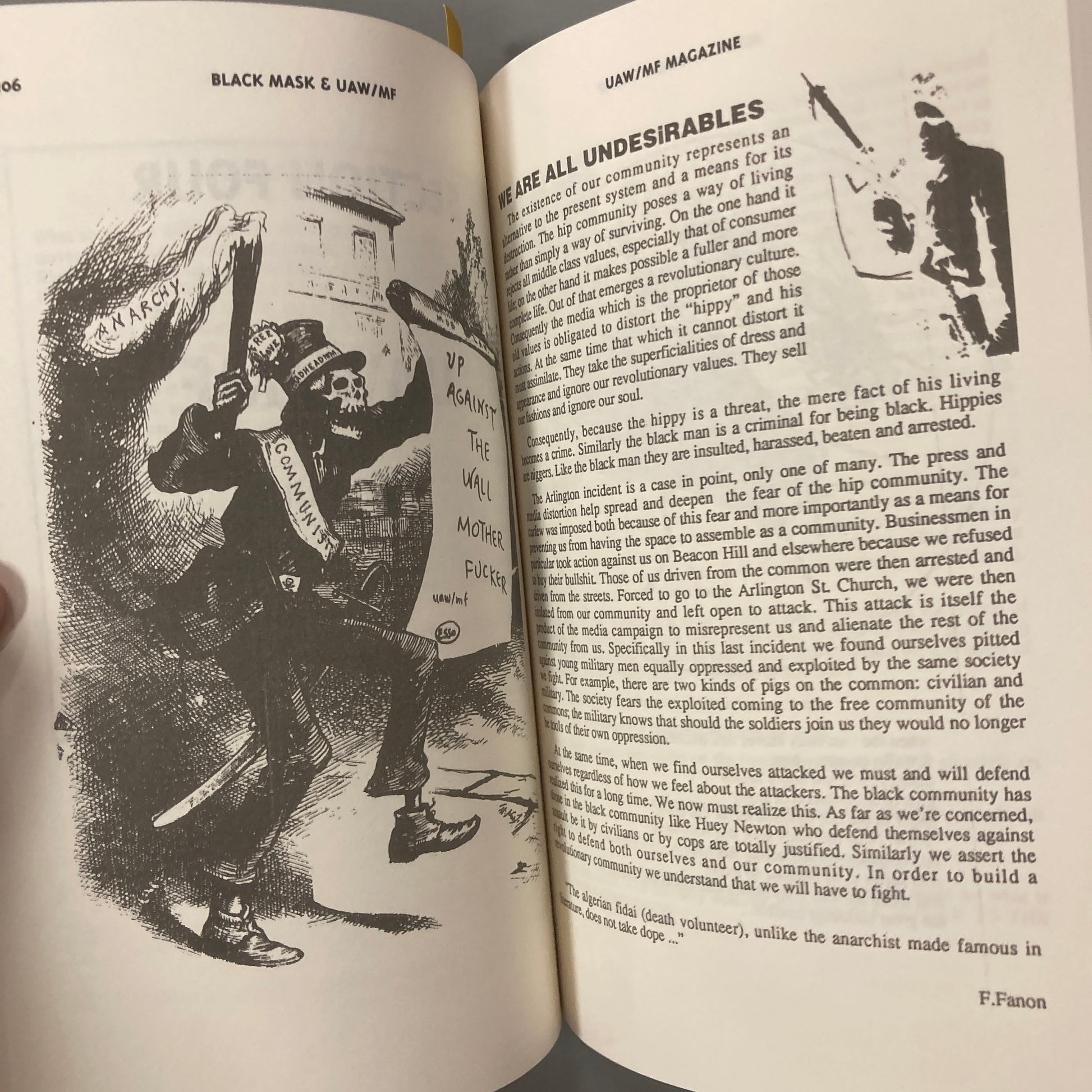 By 1968 Black Mask dissolved into “The Family” (popularly known as Up Against The Wall Motherf**ker—the name to which they signed their first leaflet), which combined the confrontational theater and tactics of Black Mask with a much more aggressively “street” approach in dealing with the police, and authorities. Dubbed a “street gang with analysis” they were reputedly the only white grouping taken seriously by the Black Panther Party, and influenced everyone from the Weathermen to the “hippy” communal movements.