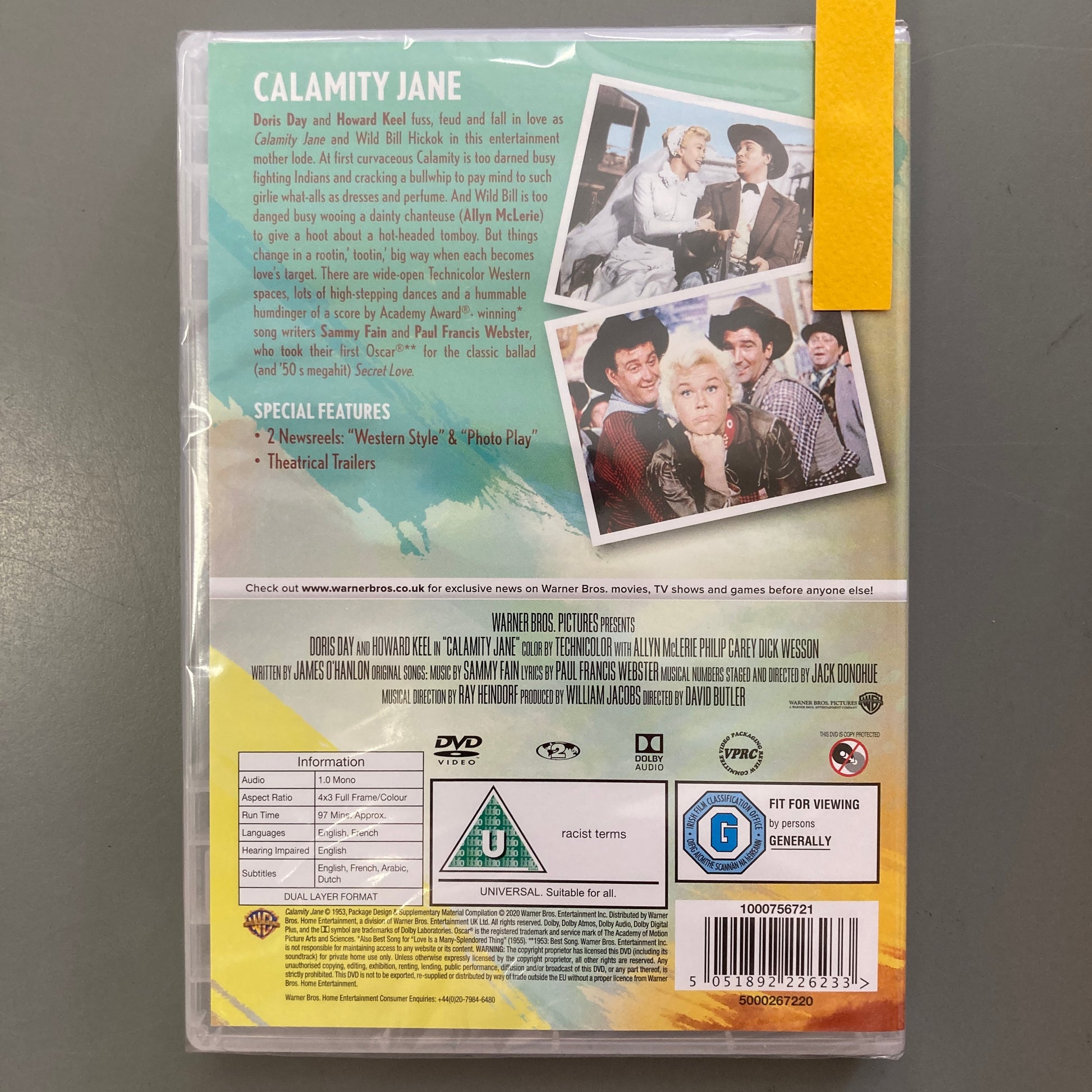 Deadwood, Dakota Territory, is largely the abode of men, where CalamityJane is as hard-riding, boastful, and handy with a gun as any. Doris Day plays the famous cowgirl in this musical extravaganza about the legendary female sharpshooter and her up-and-down romance with Wild Bill Hickock.