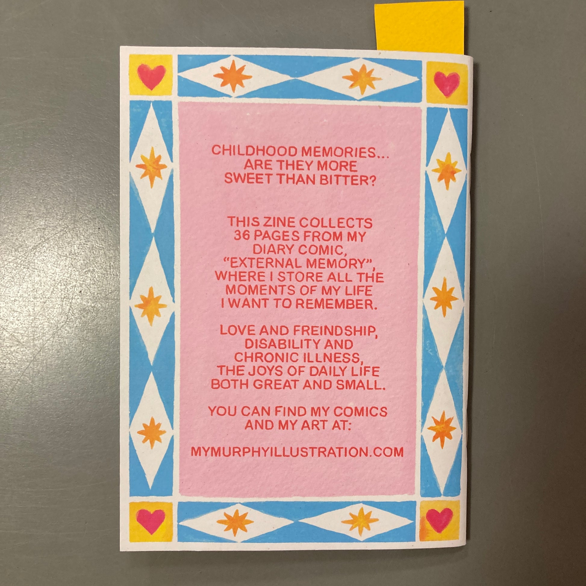 This zine collects 36 pages from my diary comic, External Memory, where I store all the moments of my life I want to remember, both from right now and back then. Love and freindship, disability and chronic illness, the joys of daily life both great and small.
