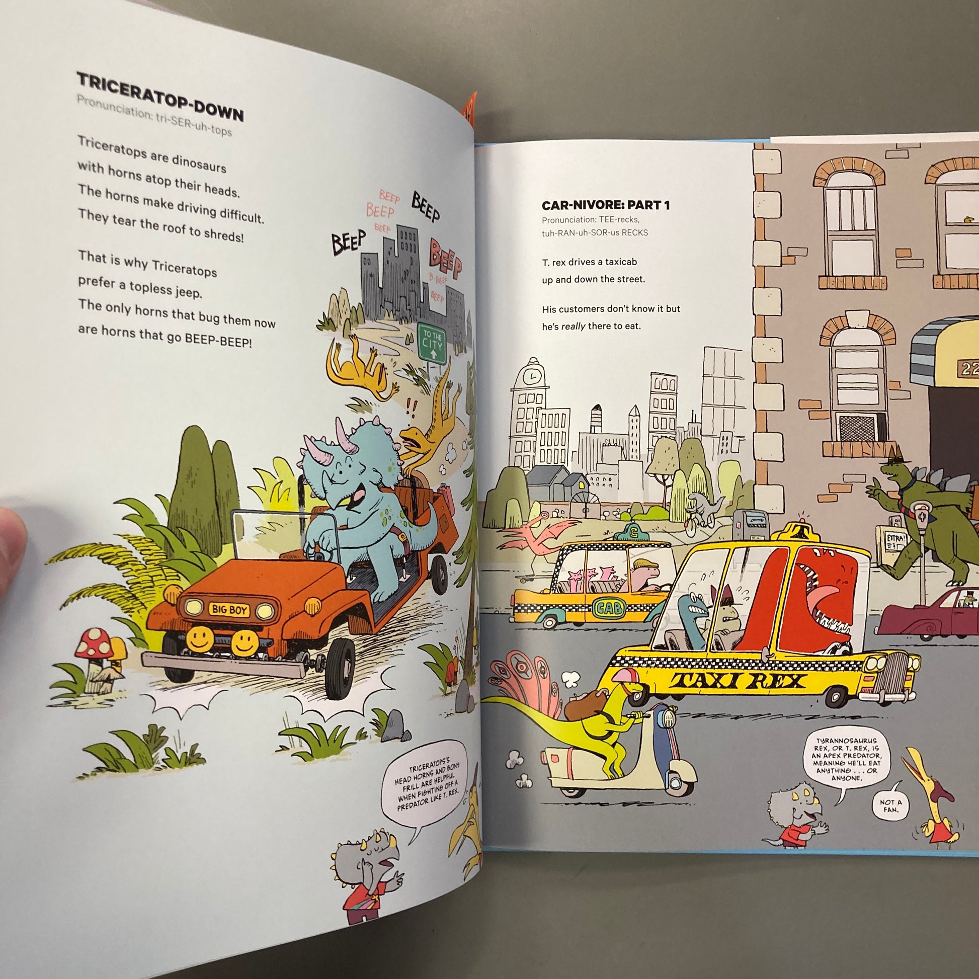 Buckle up for a raptor race, train-faring Titanosaurs and (gulp) a taxi-driving T. rex in this hilariously whirlwind picture book poetry collection for fans of Richard Scarry and Goodnight, Goodnight, Construction Site!
