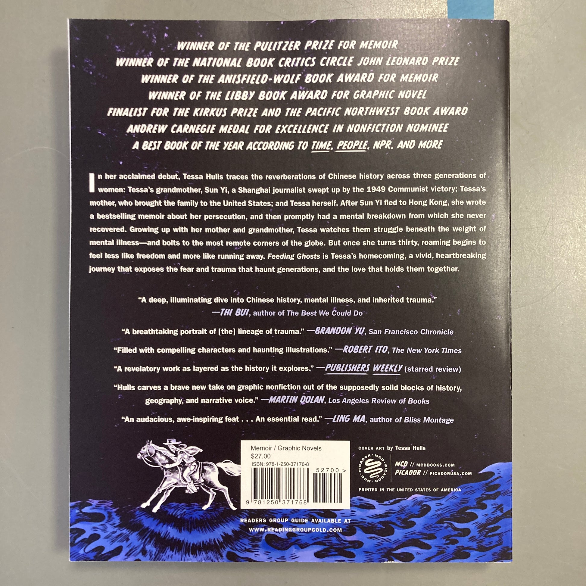 “Feeding Ghosts is an artistic and intellectual tour de force. Part mémoire, part history, it is a lesson in intentional graphic storytelling in which people are simultaneously rooted and unstuck in time and space. As profound and dark as Art Spiegelman, as mortal and relatable as Marjane Satrapi, as authentic and folksy as Li Kunwu, her artistry sews together country and family, trauma and revolution, feeling and analysis. The result is not only an expedition into Tess Hulls' family past, but also the humanity within history, the need to negotiate with the past, and the legacies of trauma within us all.”