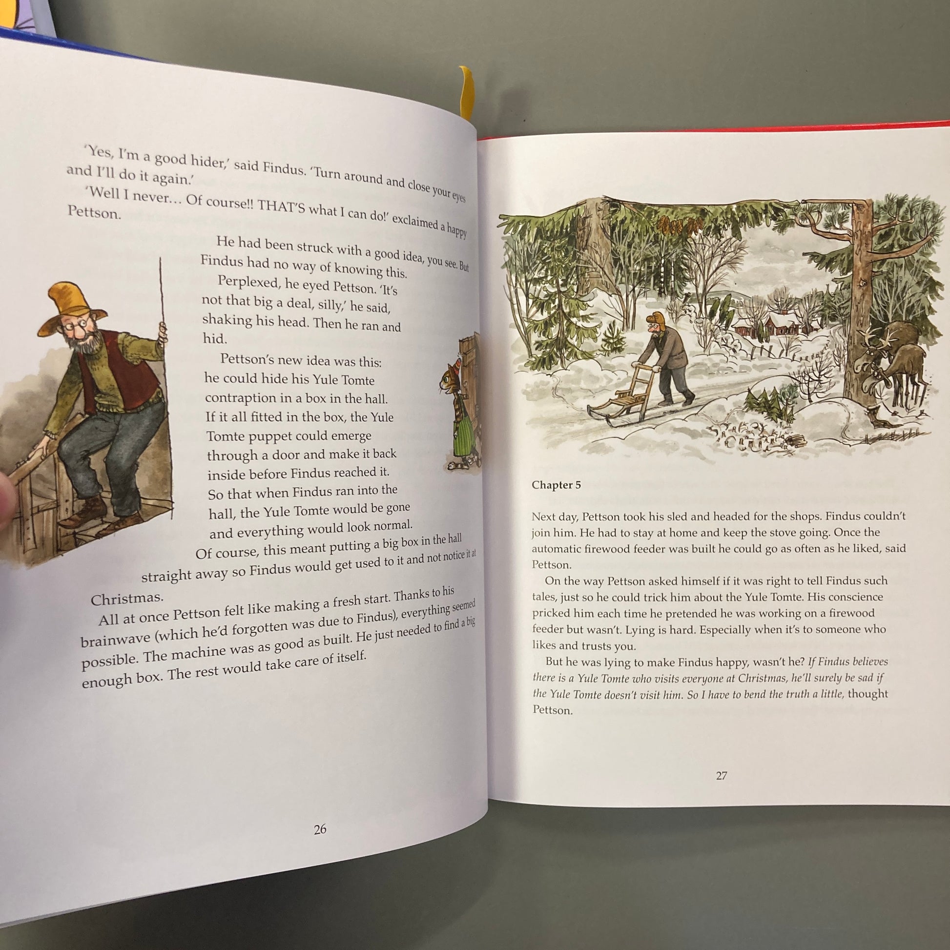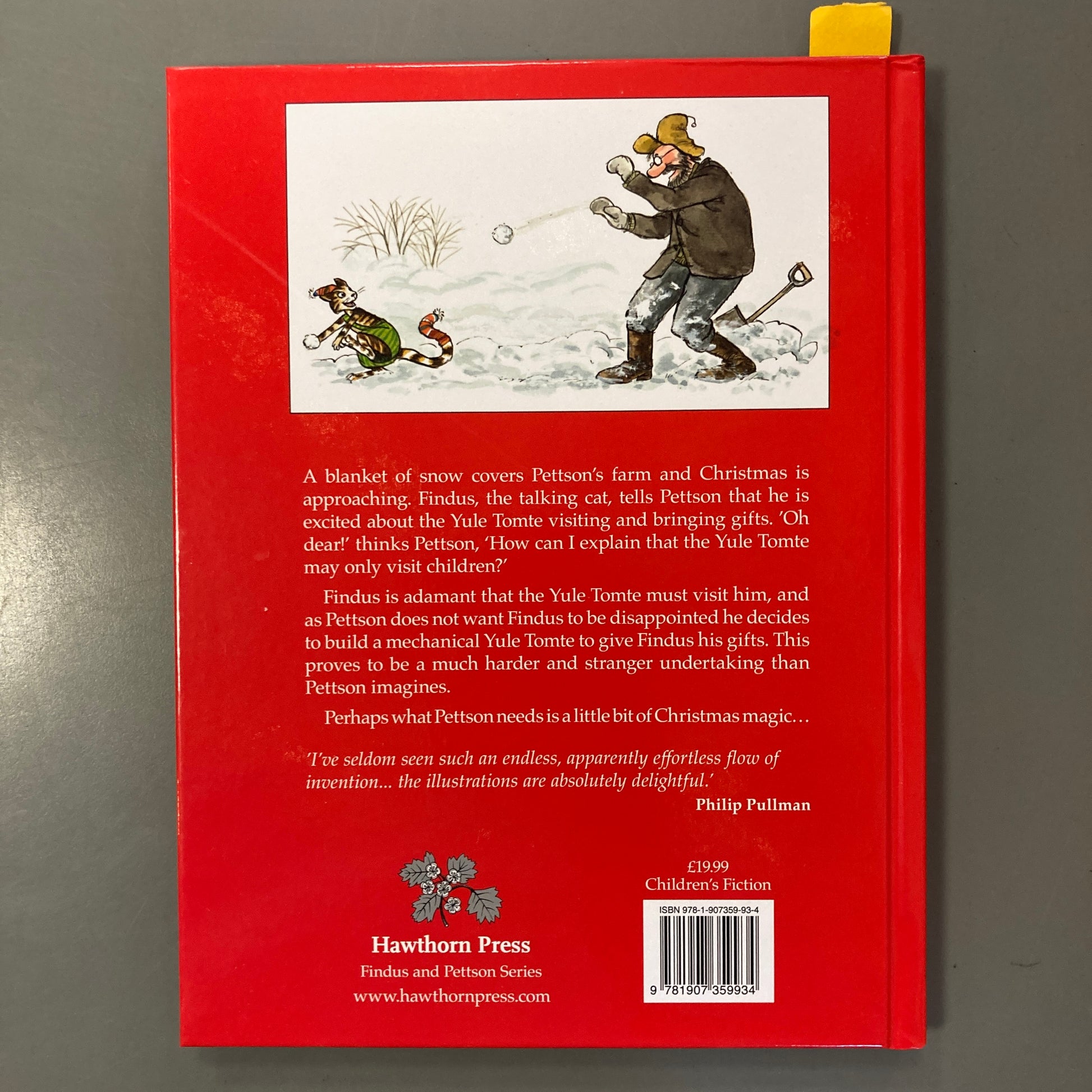 "In Sweden, where Findus and Pettson live, it is not Father Christmas who brings children their Christmas presents but the Yule Tomte (Jultomten). 'The Tomte, ' as Swedes call him, is shorter and thinner than Father Christmas and is sometimes seen riding on a goat. He prefers to deliver presents right through the front door. Instead of stealing into the house at night, he comes after dinner on Christmas Eve and asks directly, 'Are there any good children here?'" (from the book)