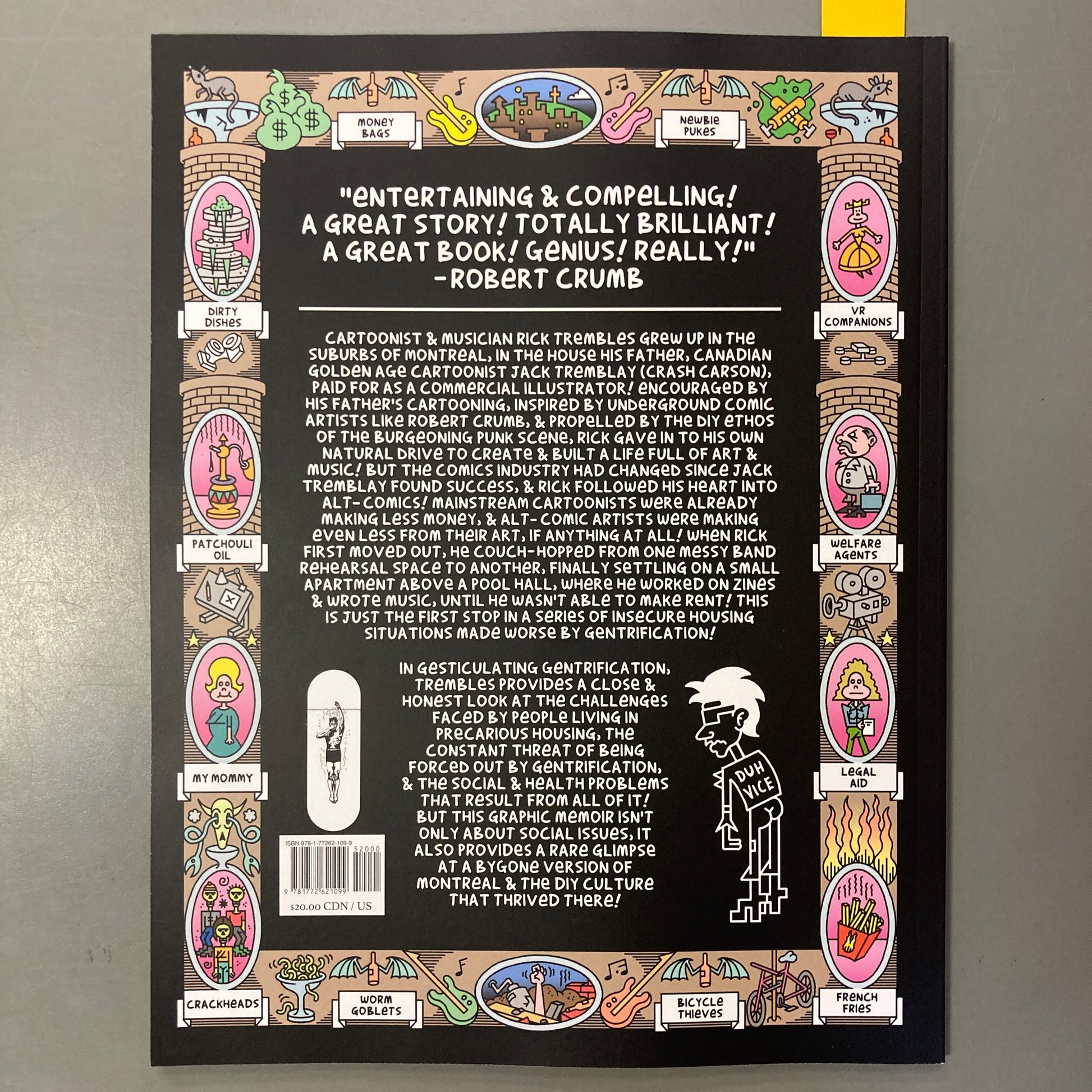 In Gesticulating Gentrification, Trembles provides a close and honest look at the challenges faced by people living in precarious housing, the constant threat of being forced out by gentrification, and the social and health problems that result from all of it. But this graphic memoir isn’t only about social issues—it also provides a rare glimpse at a bygone version of Montreal and the DIY culture that thrived there.