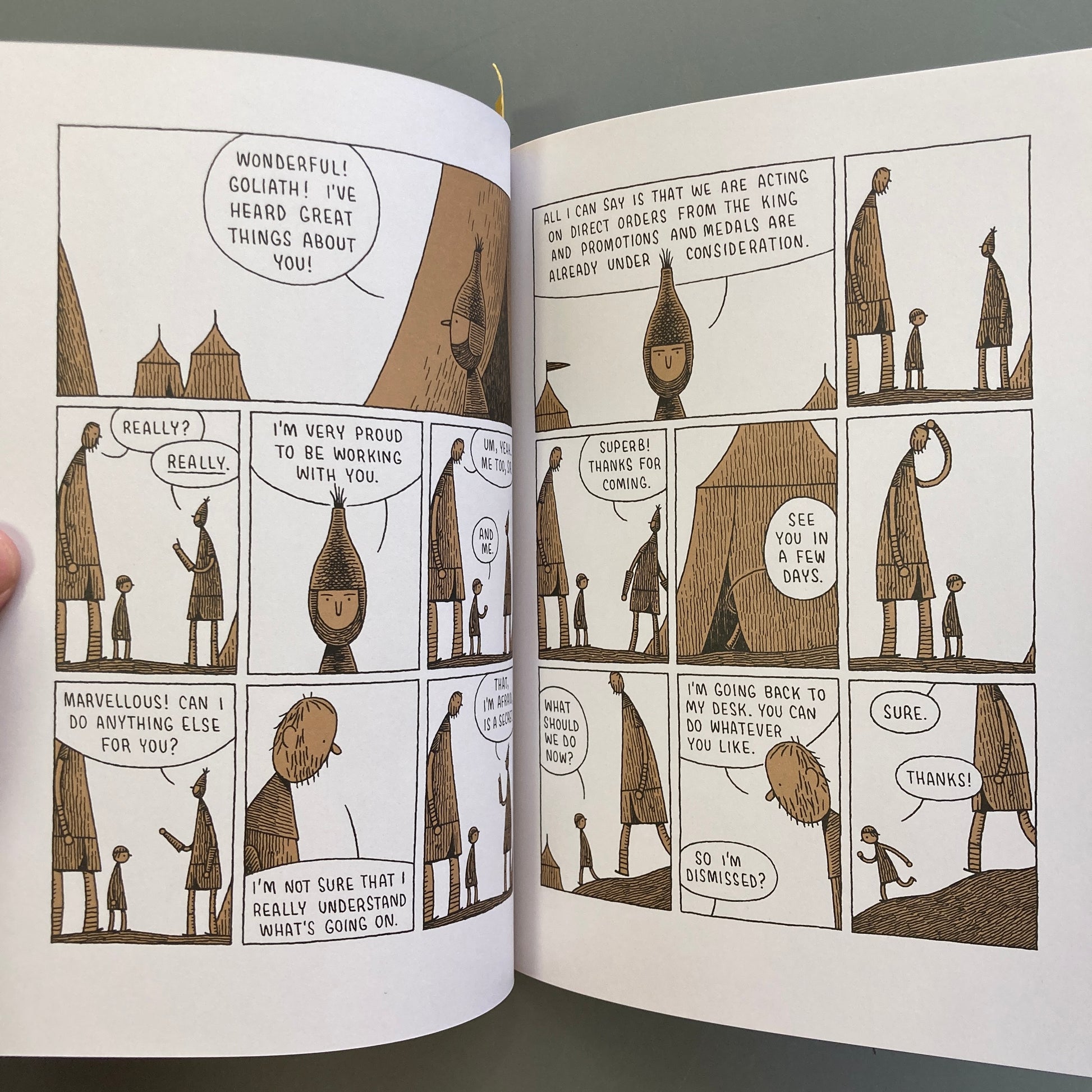 Quiet moments in Goliath’s life as an isolated soldier are accentuated by Gauld’s trademark drawing style: minimalist scenery, geometric humans, and densely crosshatched detail. Simultaneously tragic and bleakly funny, Goliath displays a sensitive wit and a bold line—a traditional narrative reworked, remade, and revolutionized into a classic tale of Gauld’s very own.
