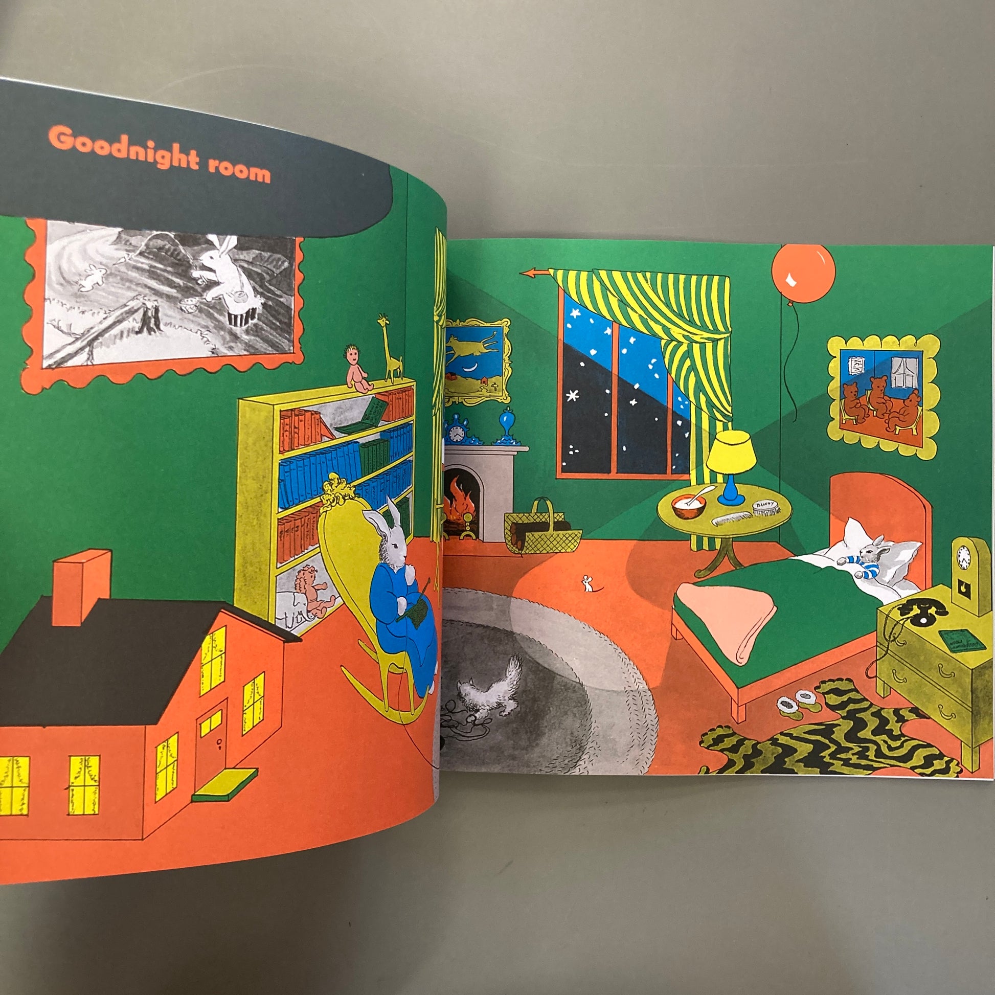 In a great green room, tucked away in bed, is a little bunny. "Goodnight room, goodnight moon." And to all the familiar things in the softly lit room—to the picture of the three little bears sitting on chairs, to the clocks and his socks, to the mittens and the kittens, to everything one by one—the little bunny says goodnight.