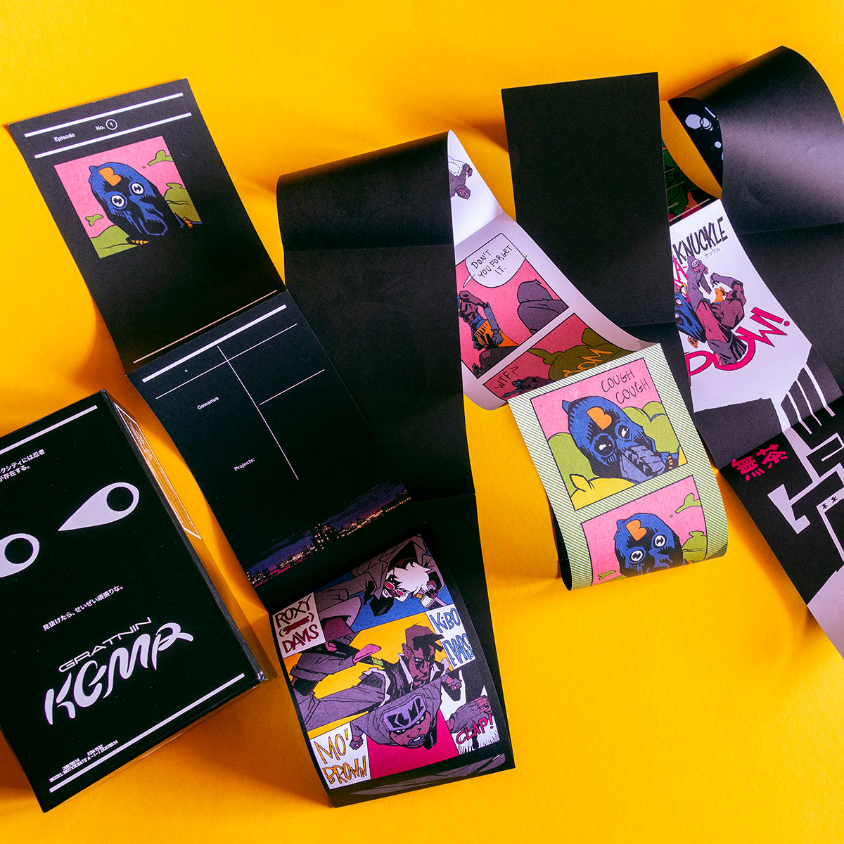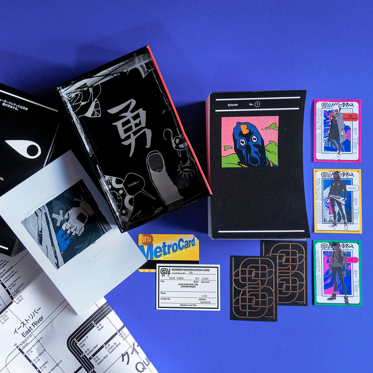Our standard edition of GratNin is a capacious accordion-fold comic over 600 pages long, printed on uncoated heavyweight stock and housed in a nesting paperboard display box and delivered with world-immersive extras such as an embossed fine art print, three GratNin trading cards, a ninja union membership card, and a subway map detailing secret routes of the GratNin world.