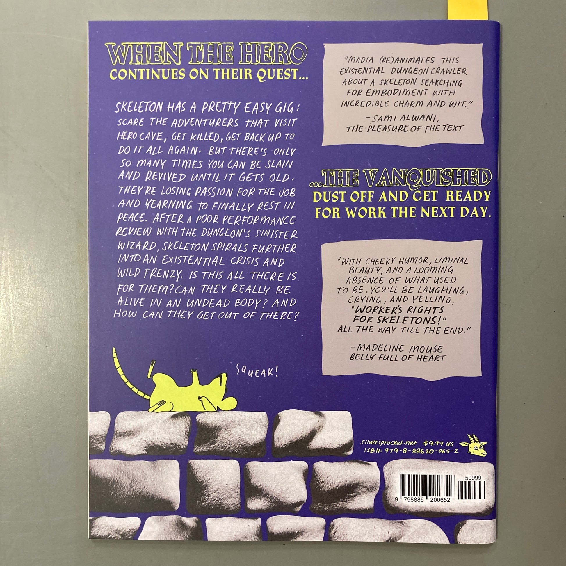 Skeleton has a pretty easy gig: scare the adventurers that visit Hero Cave, get killed, get back up to do it all again. But there’s only so many times you can be slain and revived before it gets old. They're losing passion for the job and yearning to finally rest in peace. After a poor performance review with the dungeon’s sinister wizard, Skeleton spirals further into an existential crisis and wild frenzy. Is this all there is for them? Can they really be alive in an undead body? And how can they get out of here?