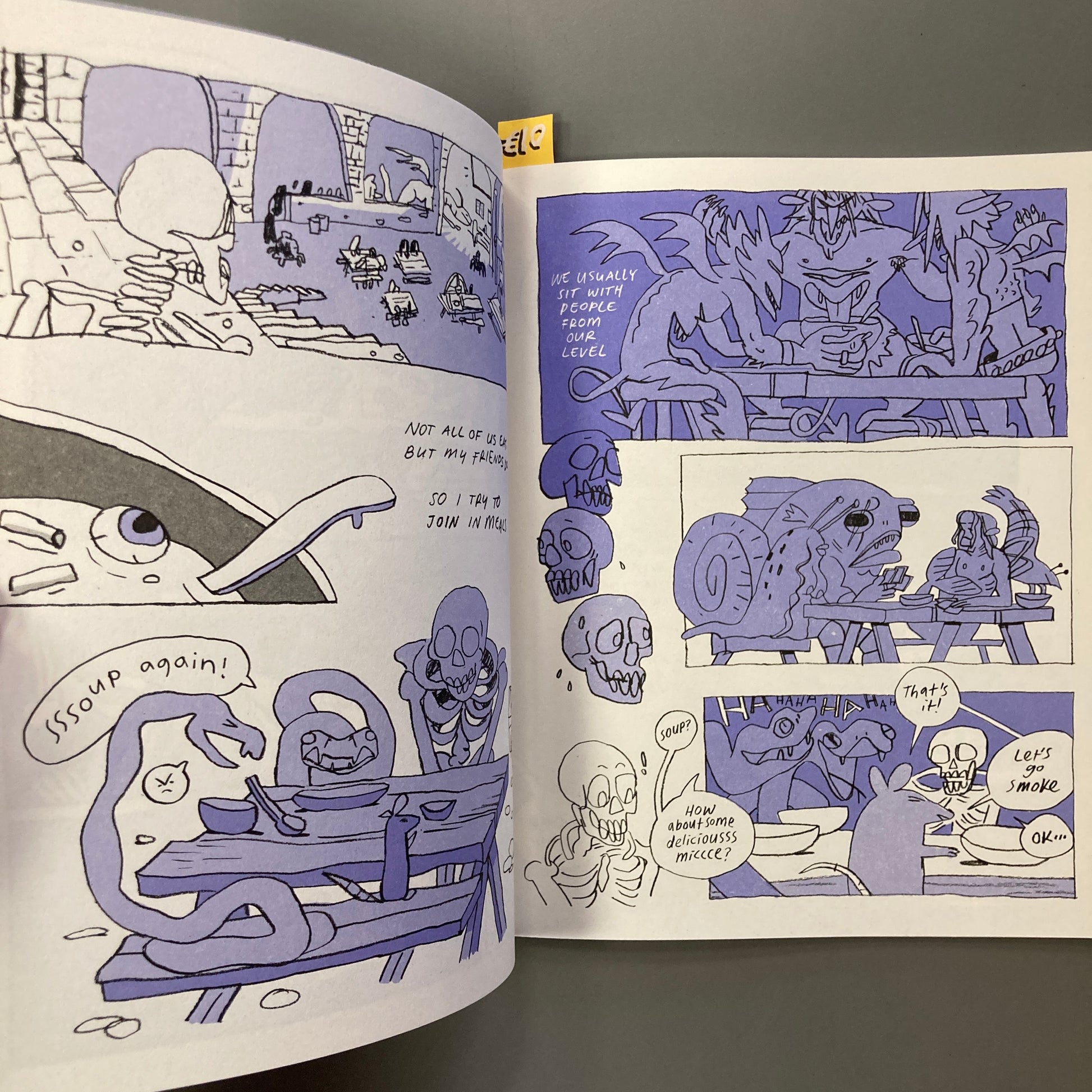 “It’s impossible not to get sucked in by the warp and woof of Syd Madia’s exuberant, funky linework! Many will find our hero’s plight all too familiar, trapped eternally in an (un)dead-end job lining the coffers of a goofy, sociopathic boss. Madia (re)animates this existential dungeon crawler about a skeleton searching for embodiment with incredible charm and wit.” – Sami Alwani, The Pleasure of the Text