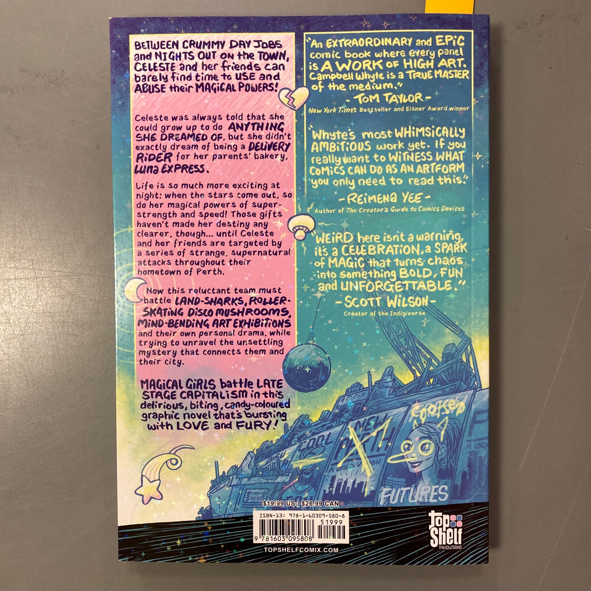 Celeste was always told that she could grow up to do anything she dreamed of, but she didn’t exactly dream of being a delivery biker for her parents’ bakery, Luna Express. Life is so much more exciting at night: When the stars come out, so do her magical powers of super-strength and speed! Those gifts haven’t made her destiny any clearer, though…until Celeste and her friends are targeted by a series of strange, supernatural attacks throughout their hometown of Perth. Now this reluctant team must battle land-sharks, roller-skating disco mushrooms, mind-bending art exhibitions, and their own personal drama, while trying to unravel the unsettling mystery that connects them and their city.