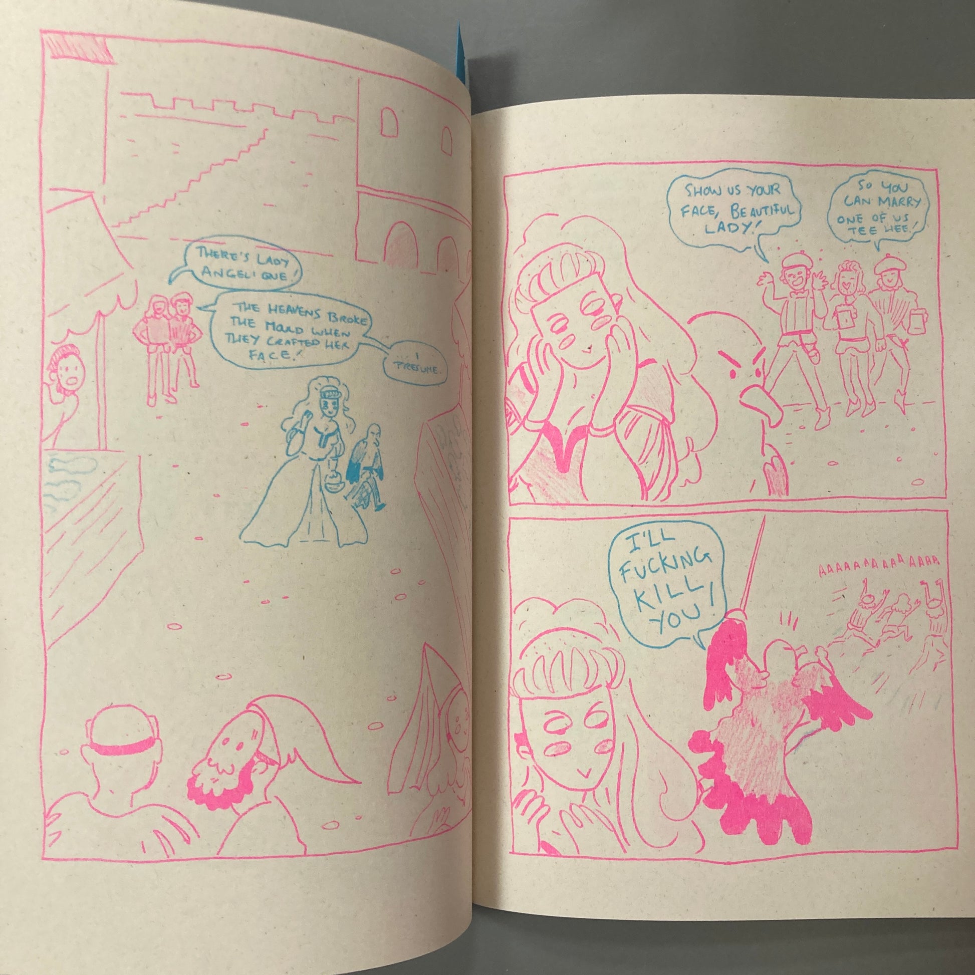 This comic marked my first successful 24 hour comic since 2019! It was also my first experience printing a comic by riso! I printed and did pre-press on the comic myself, using flouro pink, medium blue, blue, and yellow.