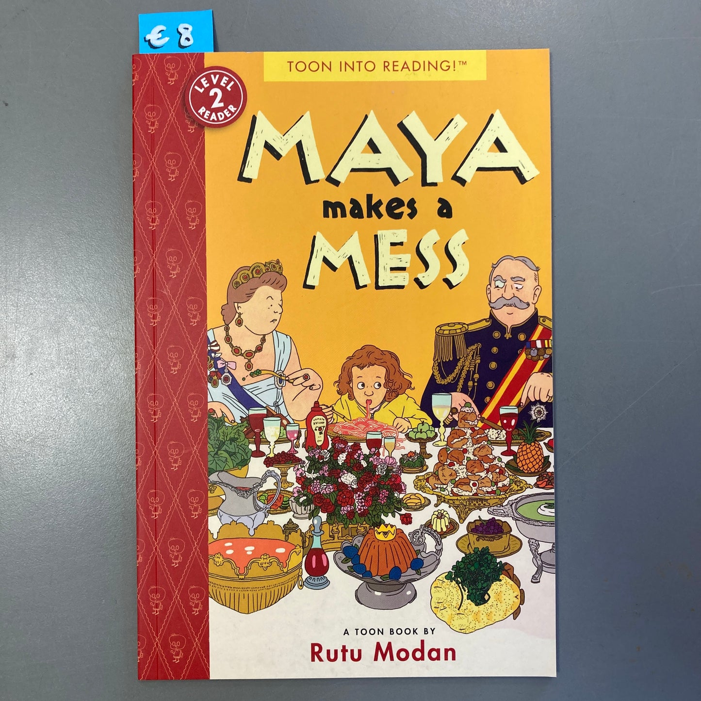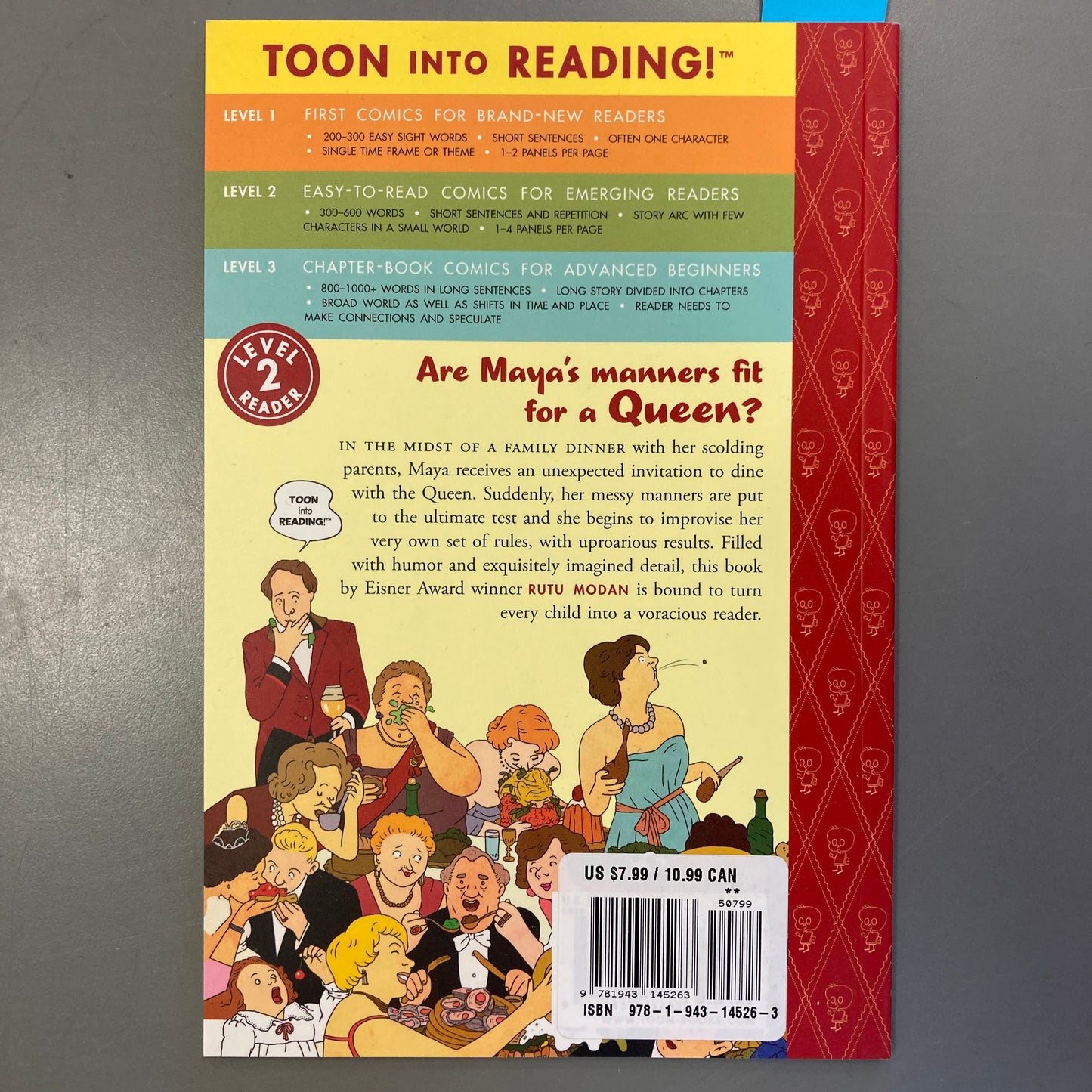 “Maya’s table manners are just terrible, so when she’s invited to dine with the queen, there is due cause for concern. When the offerings at the banquet run to such child-unfriendly choices as snail salad, ham jelly, and spinach juice, the frank and confident Maya asks to be provided with pasta and ketchup instead. The queen, rather than being offended, finds Maya’s approach to mealtime charming and, corgi at her side, takes bad dining manners to the outer limits before declaring that all will eat Maya’s way—but only on holidays. Modan’s beautifully expressive clear-line cartoons work well in a story for children, and the story itself has just the right twists for new readers to enjoy and maybe even hazard a chance of predicting. In addition to mealtime scenes, we travel with Maya by airplane to visit the queen, and the number of visual riffs on British ceremony and high etiquette gives much for the reader to explore, along with the accessible text. Another winner from TOON.”