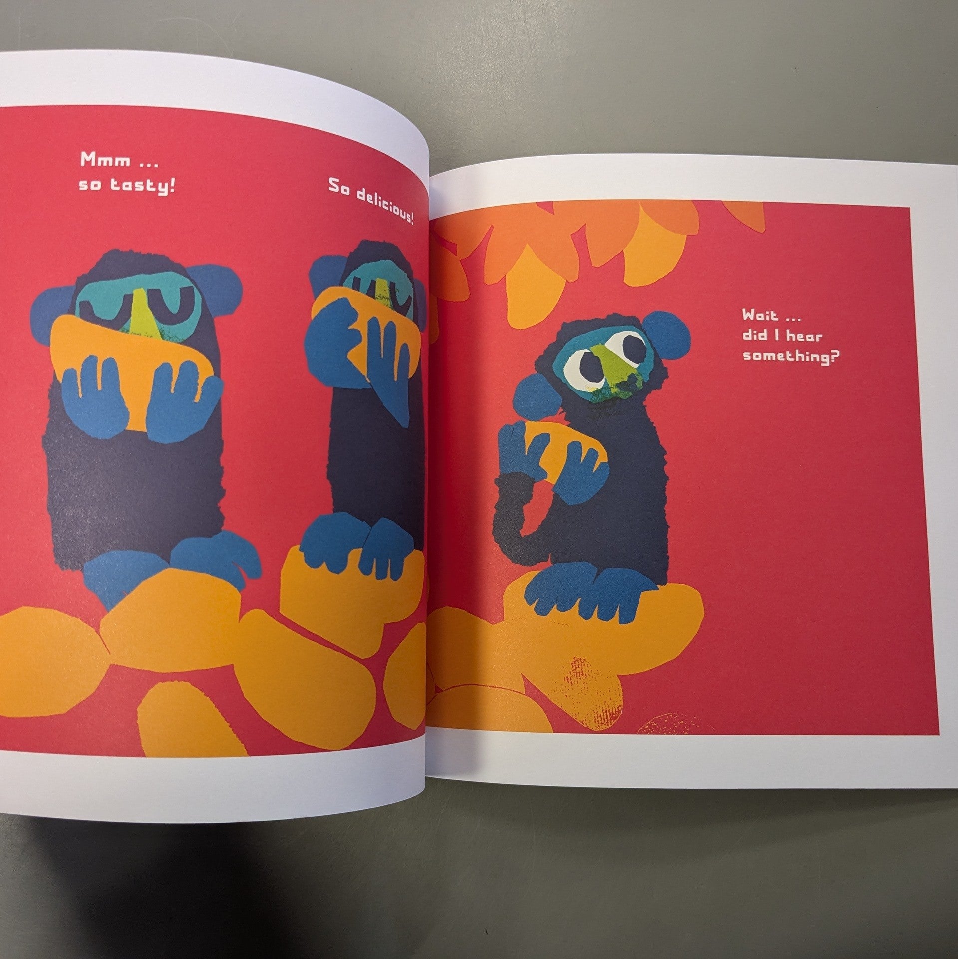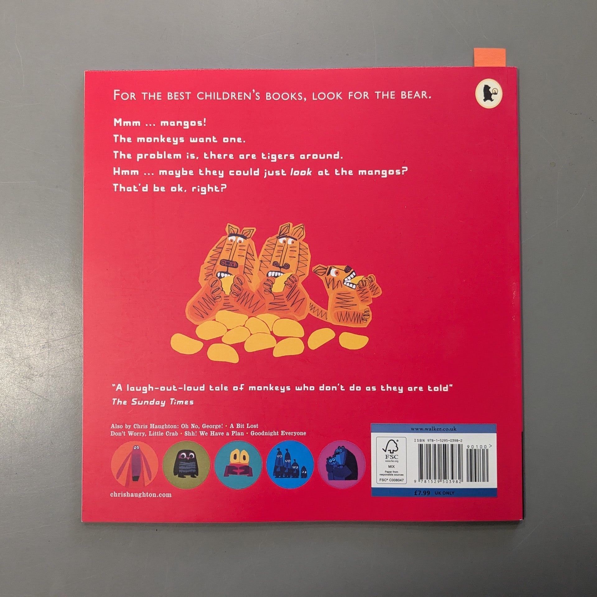 Three little monkeys and their big monkey are sitting high on a branch in the forest canopy. “OK, monkeys! I’m off," says the big monkey. “Remember . . . Whatever you do, do NOT go down to the mango tree. There are tigers down there.” Mmm . . . mangoes! think the little monkeys. They LOVE mangoes. Hmm . . . Maybe . . . maybe they could justlook at the mangoes. That would be OK, right? With vivid colors, bold shapes, and his trademark visual humor, Chris Haughton is back with a deliciously suspenseful cautionary tale about pushing boundaries—and indulging your more impish side (when nobody is looking).