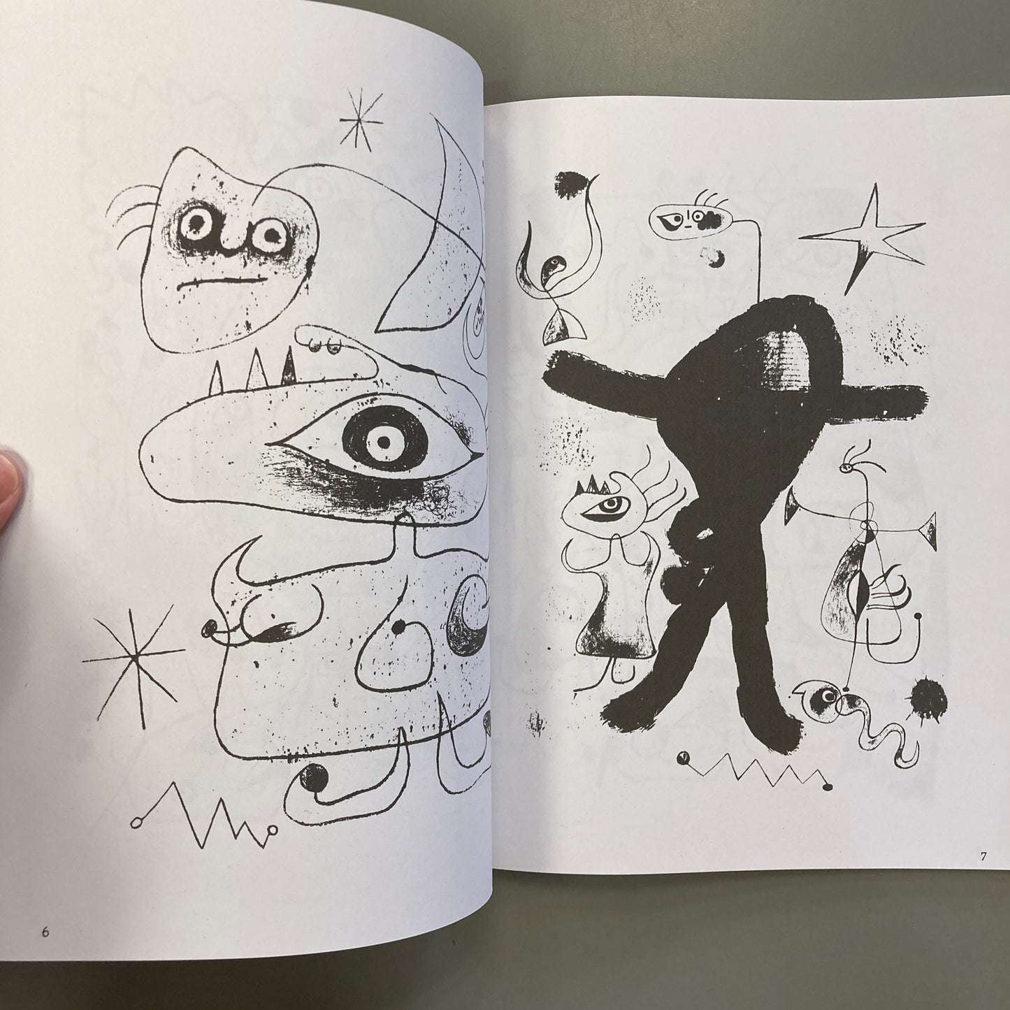 "It's never easy for me to talk about my painting," wrote Miró, "since it is always born in a state of hallucination induced by some kind of shock, objective or subjective, for which I am not personally responsible in the least." Miró hallucinates on stone for these prints, filling them with monstrous beasts and one-eyed aliens adrift in a heaven of moons and stars and black nebulae, floating breasts and generative organs. These lithographs were executed shortly after finishing the famous "constellation" series of paintings (called by one critic "the most intricate, most elaborately developed of all Miró's compositions"), right around the time his mother died and he fired his first ceramics in collaboration with Artigas. Falling in a period of intense creative mingling of whimsy with the grotesque, these prints characterize an important juncture in Miró's career. They also enlarge the boundaries of lithographic technique as they simultaneously show Miró, now "stripped" of his brilliant colors, to be an equal master of black-and-white.