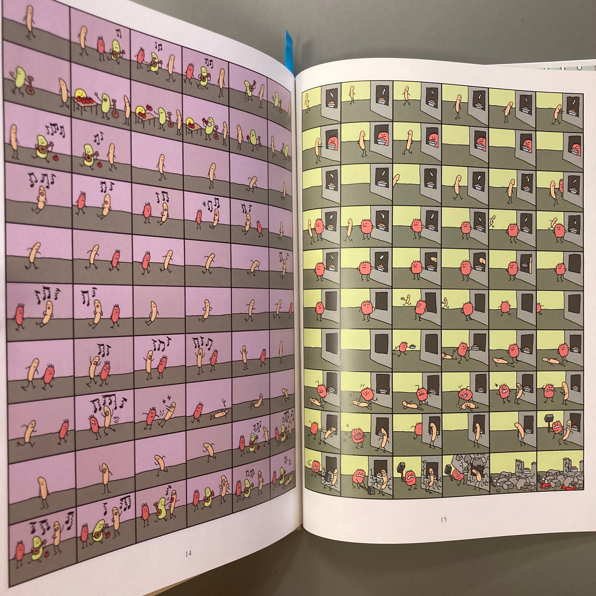 After Mister O comes now Mister I. In hundreds of little squares the author depicts Mister I’s fruitless search for food. However hard he tries, he’s not able to lay hands on an apple, a fish or a piece of cake. Tunnels, constructions or theft don’t help. He’s not afraid of a little violence either, and though he often gets him very close, it always turns against him.