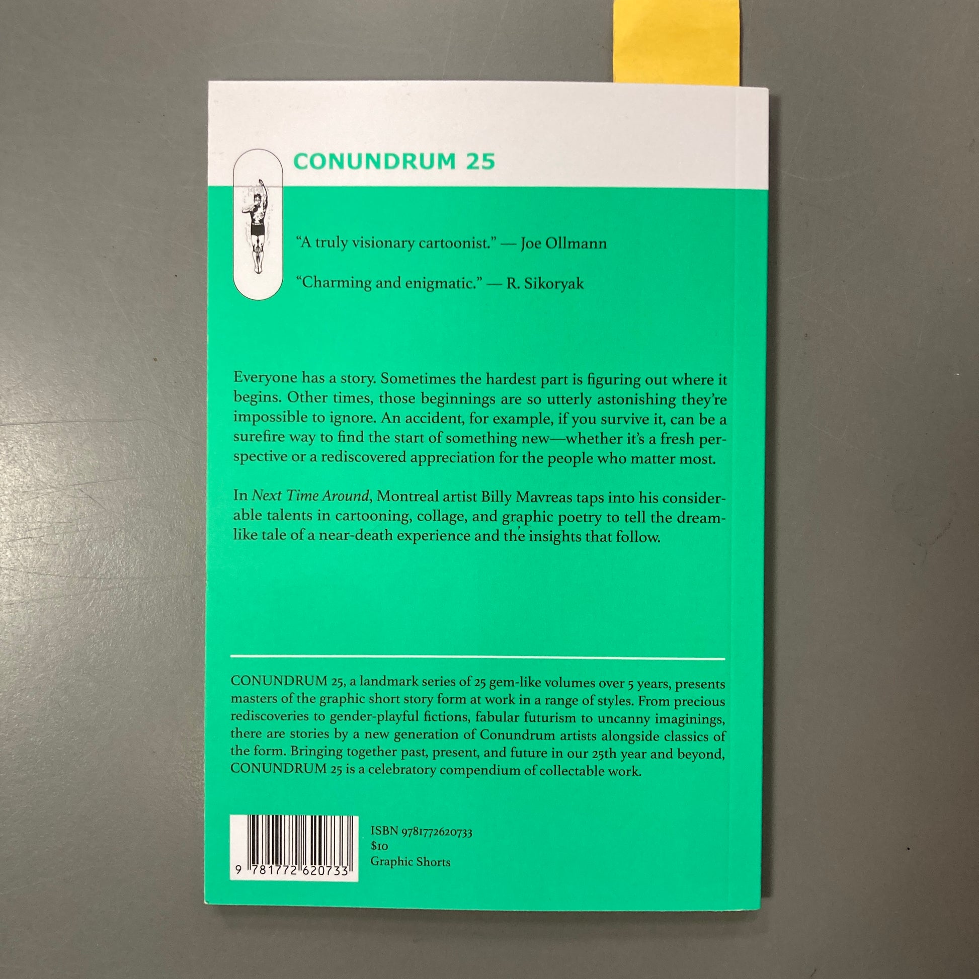 In Next Time Around, Montreal artist Billy Mavreas taps into his considerable talents in cartooning, collage, and graphic poetry to tell the dreamlike tale of a near-death experience and the insights that followed.