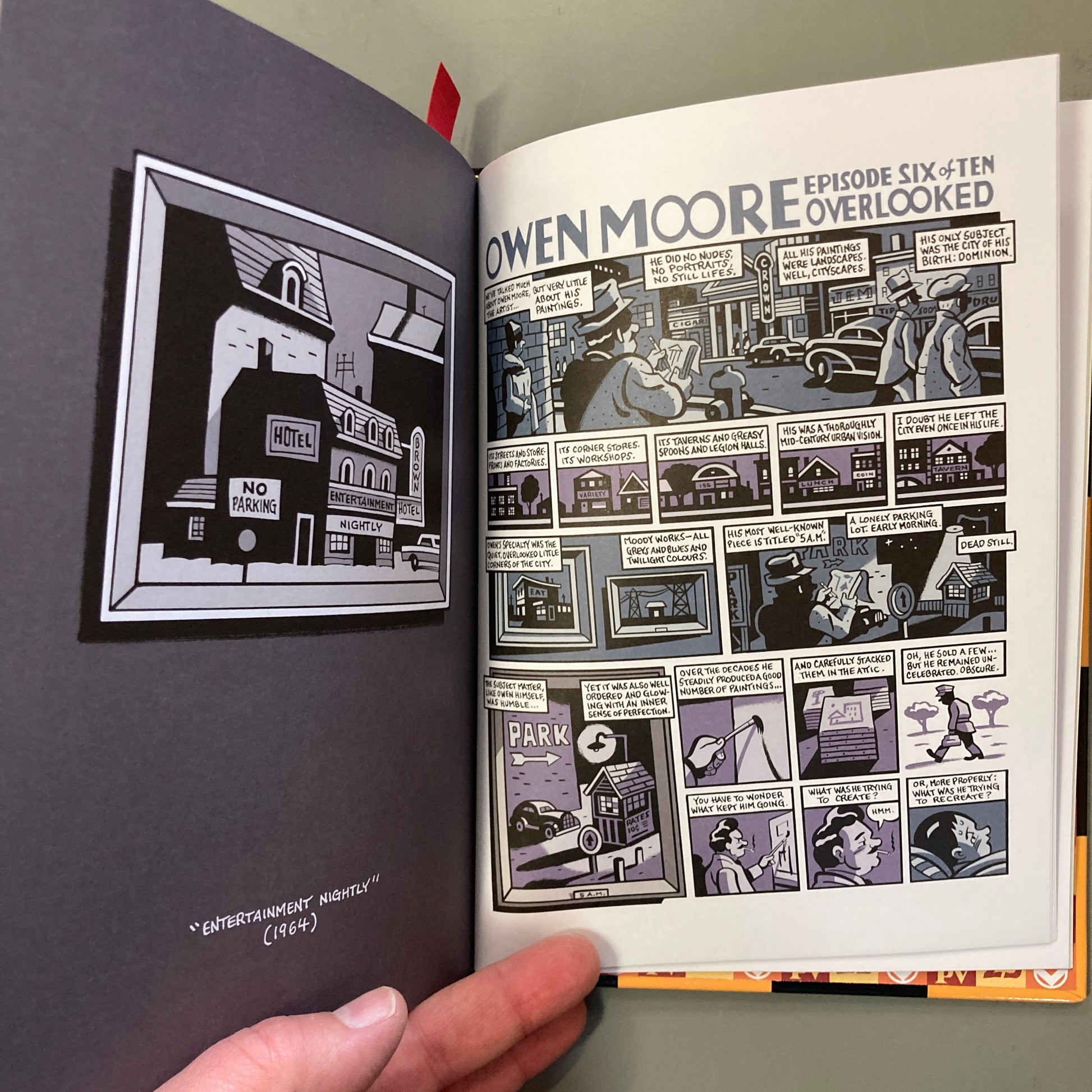 Lastly, the life and death of post-humorously renowned Dominion painter Owen Moore is told through comics in ten episodes. Originally serialized in The Walrus, this is the first time the story has been collected. Pages from the original sketchbook version and the final art are presented in pairs, revealing Seth’s process to readers.