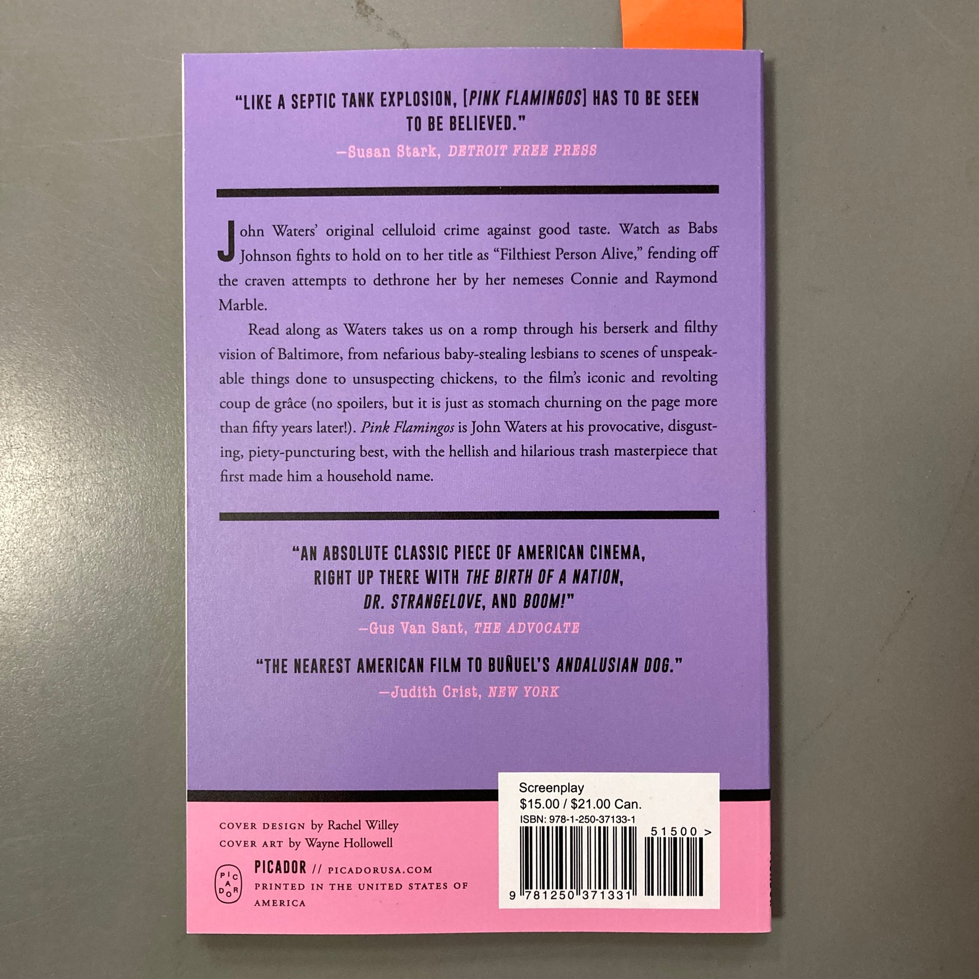 Read along as Waters takes us on a romp through his camp and filthy vision of Baltimore, from nefarious baby-stealing lesbians to scenes of unspeakable things done to unsuspecting chickens, to the film’s iconic and revolting coup de grace (no spoilers, but it is just as stomach-churning on the page more than fifty years later!). Pink Flamingos is John Waters at his provocative, disgusting, piety-puncturing best, with the hellish and hilarious trash masterpiece that first made him a household name.
