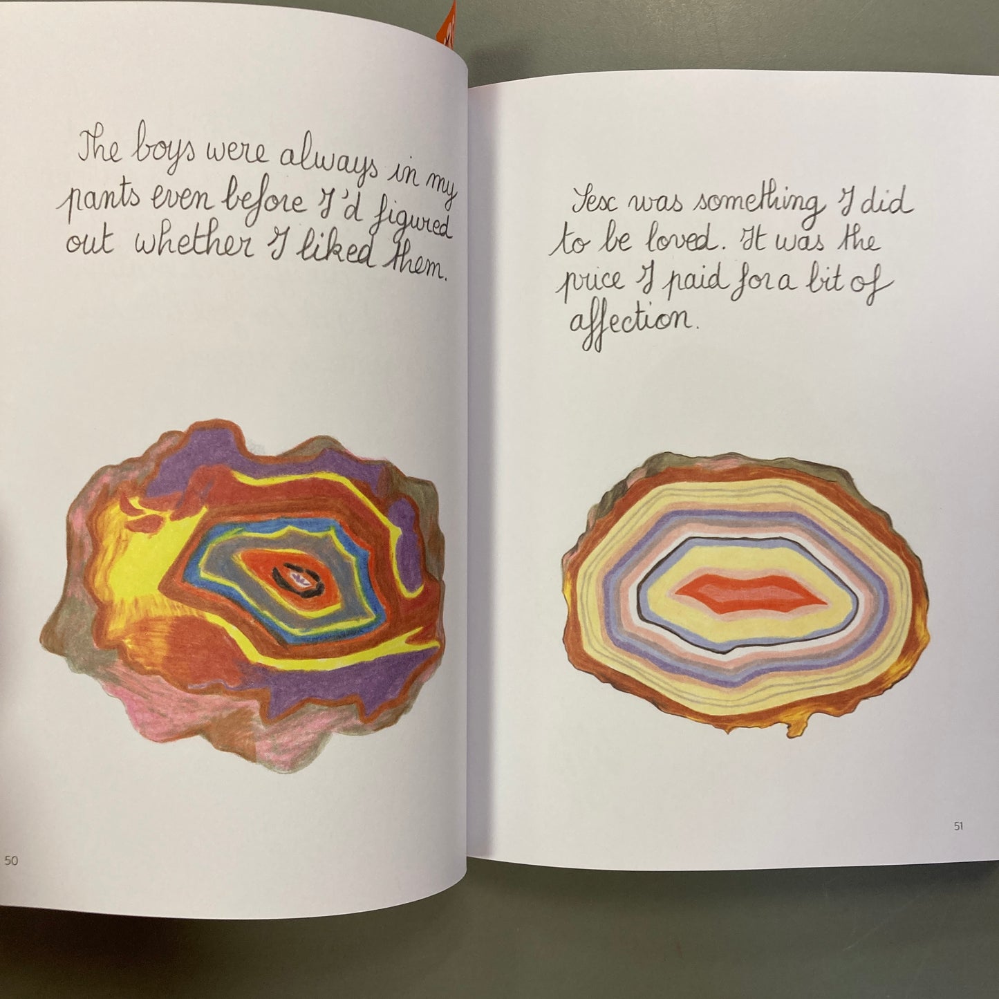 Delporte’s idyllic colored pencil drawings contrast with the near urgency that structures her confessional memoir. Each page is laden with revelation and enveloped in organic, natural shapes—rocks, flowers, intertwined bodies, women’s hair blowing in the wind—captured with devotion. The vitality of these forms interspersed with Delporte’s flowing handwriting hold space for her vivid and affecting observations.