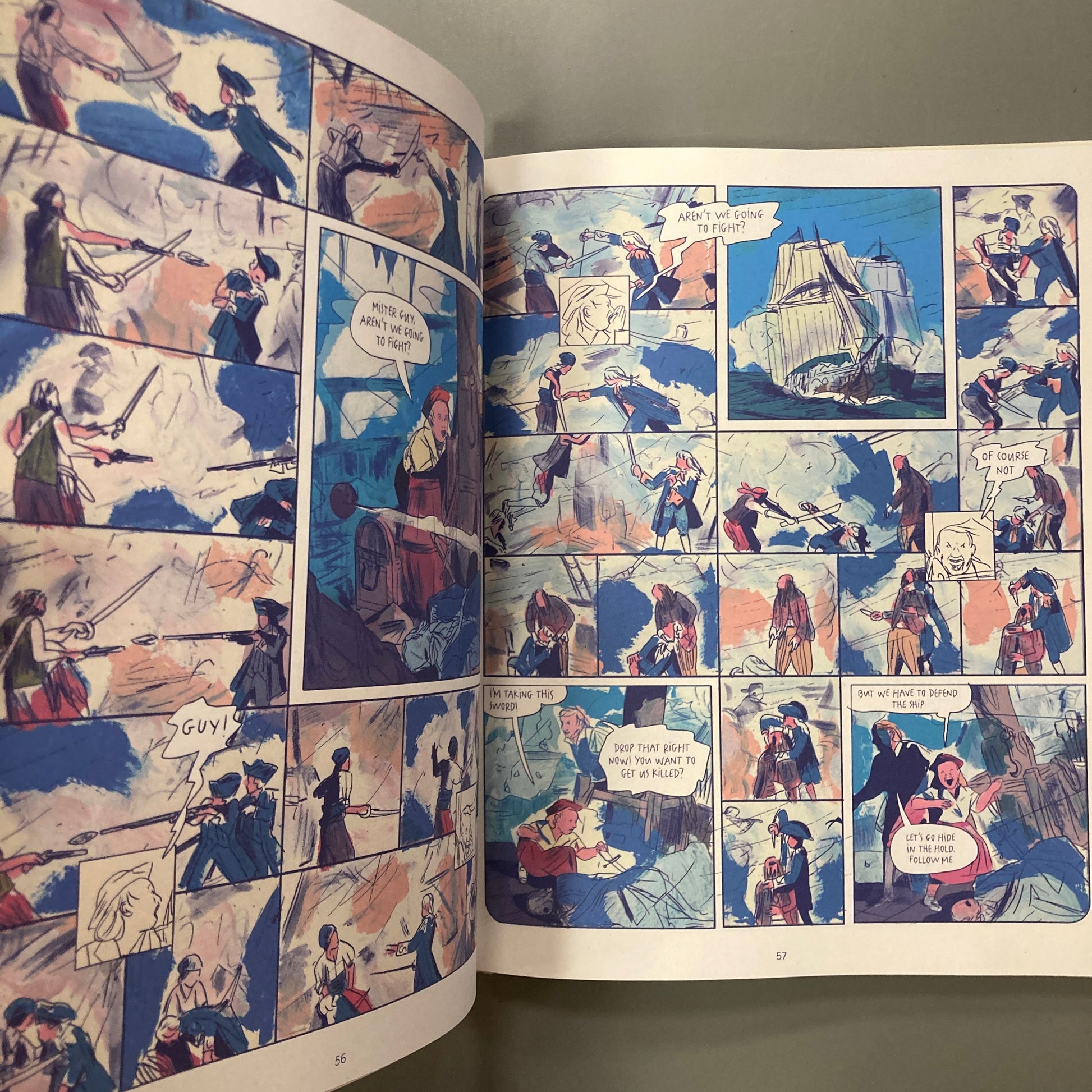 Guy is no master mariner, with a clipped red (or black) beard. He's just an ordinary member of the crew — able enough, but also a lazy, cowardly liar, a drunkard, and a thief. His story is told in two allegorical parts: "The Blowout" and "The Hangover." Three contemporary comics titans, Belgian Olivier Schrauwen (Parallel Lives) and the French duo Ruppert and Mulot (The Perineum Technique) collaborate to bring you the best pictorial and narrative elements of the great tales of the sea — bright colors, grand battles, gallows humor — in this tour de force of black comedy.
