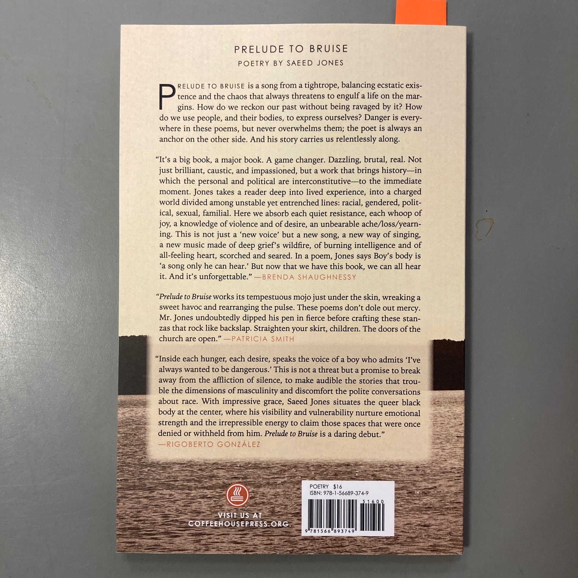 "Prelude to Bruise works its tempestuous mojo just under the skin, wreaking a sweet havoc and rearranging the pulse. These poems don't dole out mercy. Mr. Jones undoubtedly dipped his pen in fierce before crafting these stanzas that rock like backslap. Straighten your skirt, children. The doors of the church are open."—Patricia Smith