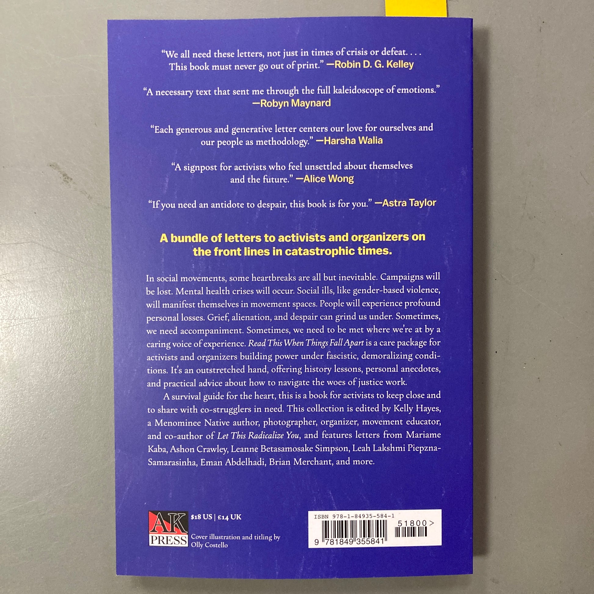 In social movements, some heartbreaks are all but inevitable. Campaigns will be lost. Mental health crises will occur. Social ills, like gender—based violence, will manifest themselves in movement spaces. People will experience profound personal losses. Grief, alienation, and despair can grind us under. Sometimes, we need accompaniment. Sometimes, we need to be met where we’re at by a caring voice of experience. Read This When Things Fall Apart is a care package for activists and organizers building power under fascistic, demoralizing conditions. It’s an outstretched hand, offering history lessons, personal anecdotes, and practical advice about how to navigate the woes of justice work. A survival guide for the heart, this is a book for activists to keep close, and to share with co—strugglers in need.