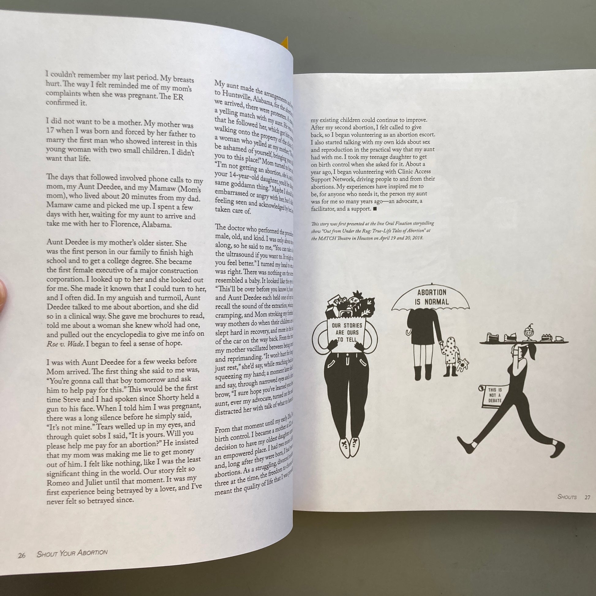 Following the U.S. Congress’s attempts to defund Planned Parenthood, the hashtag #ShoutYourAbortion became a viral conduit for abortion storytelling, receiving extensive media coverage and positioning real human experiences at the center of America’s abortion debate for the very first time. The online momentum sparked a grassroots movement that has subsequently inspired countless individuals to share their abortion stories in art, media, and community events all over the country, and to begin building platforms for others to do the same.