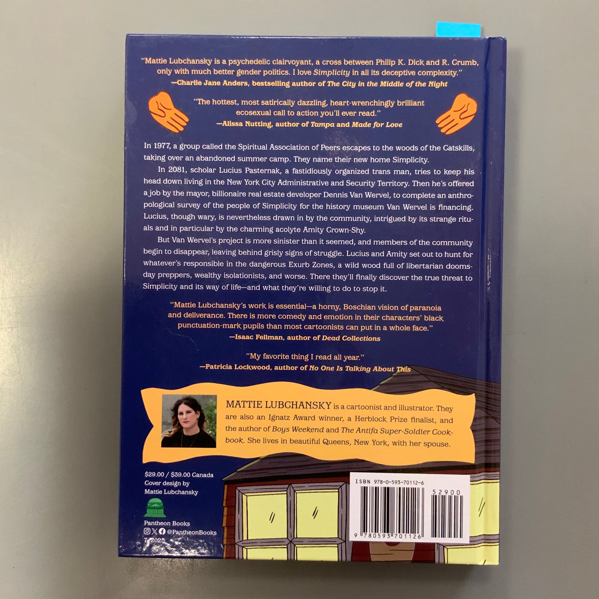 In 2081, scholar Lucius Pasternak, a fastidiously organized trans man, tries to keep his head down living in the New York City Administrative and Security Territory, which was founded after the formal dissolution of the United States in 2041. Then, he's offered a job by the mayor, billionaire real estate developer Dennis Van Wervel, to complete an anthropological survey of the people of Simplicity for a history museum he's financing. A wary Lucius is nevertheless drawn in by the people of the small wooded community, intrigued by its strange rituals and in particular by the charming acolyte Amity Crown-Shy. Born and raised on the compound, Amity is comfortable in their own skin, a striking contrast to Lucius' repressed reserve. But Lucius' control starts to slip when he begins to suffer visions both terrifying and sensual—visits from beautiful but nightmarish creatures.