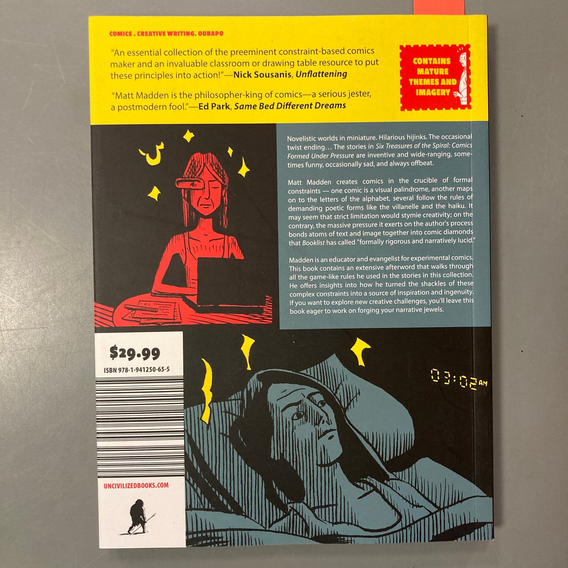 An author struggles to understand an encounter on the subway that has led her to romantic despair. Six characters embark on a dangerous voyage, searching for a mysterious treasure. A cartoon character finds himself in bizarre yet uncannily familiar scenarios. Three characters obsess over the same image and sense that their lives connect across generations. Novelistic worlds in miniature. Hilarious hijinks. The occasional twist ending… The stories in Six Treasures of the Spiral: Comics Formed Under Pressure are inventive and wide-ranging, sometimes funny, occasionally sad, and always offbeat. The New York Times called Matt Madden a "stuntman-philosopher" because he creates comics in the crucible of formal constraints — one comic is a visual palindrome, another maps on to the letters of the alphabet, several follow the rules of demanding poetic forms like the villanelle and the haiku. It may seem that strict limitation would stymie creativity; on the contrary, the massive pressure it exerts on the author's process bonds atoms of text and image together into comic diamonds that Booklist has called "formally rigorous and narratively lucid." Madden is an educator and evangelist for experimental comics. This book contains an extensive afterword that walks through all the game-like rules he used in the stories in this collection. He offers insights into how he turned the shackles of these complex constraints into a source of inspiration and ingenuity. If you want to explore new creative challenges, you'll leave this book eager to work on forging your narrative jewels.