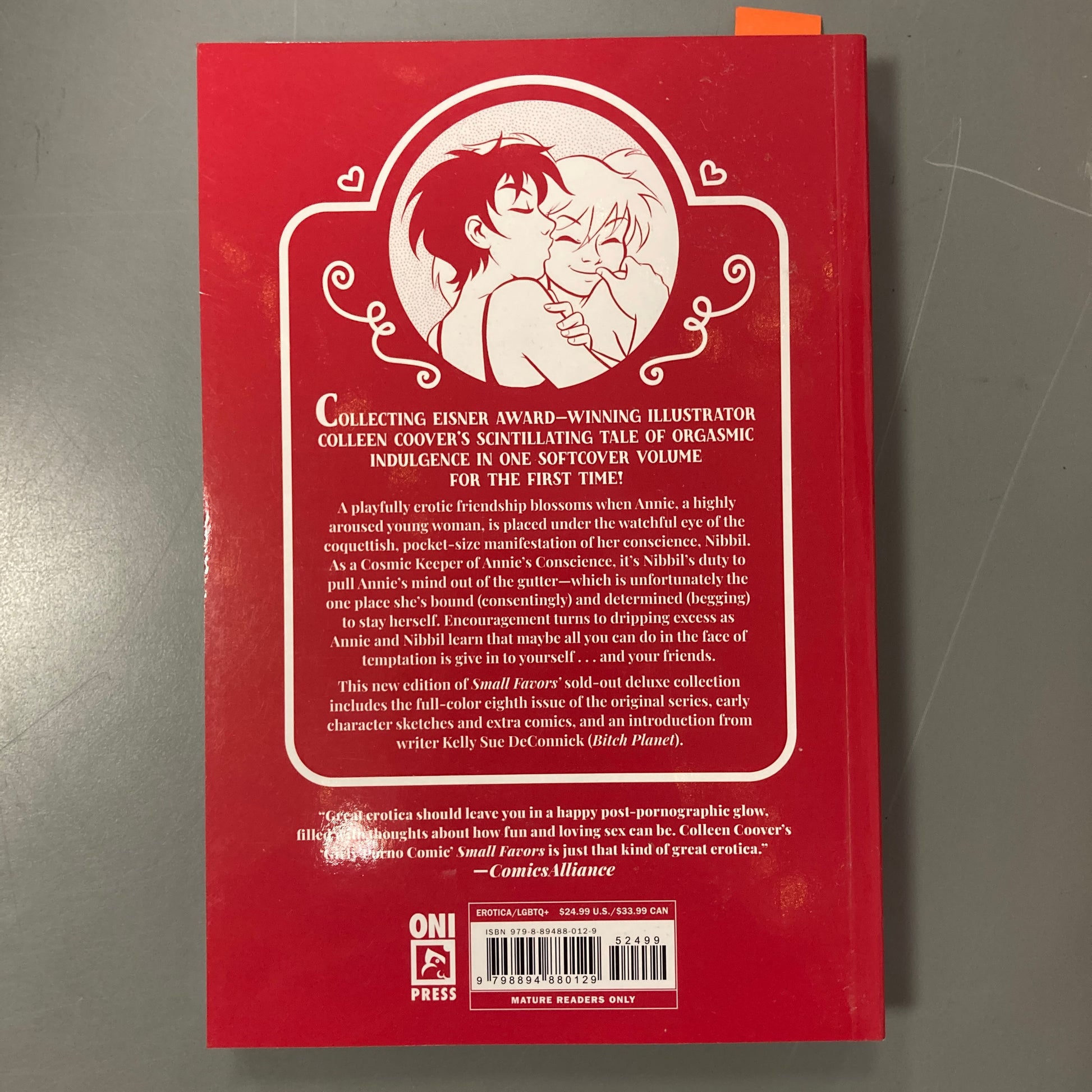 Collecting Eisner Award–winning Illustrated by Colleen Coover’s scintillating tale of sapphic friendship, love, and orgasmic indulgence in one softcover volume for the first time! Small Favors explores the playfully erotic romance between a highly aroused young woman, Annie, and the coquettish, pocket-size manifestation of her conscience, Nibbil. As a Cosmic Keeper of Annie’s Conscience, it’s Nibbil’s job to pull Annie’s mind out of the gutter—which is unfortunately the one place she’s bound (consentingly) and determined (begging) to stay herself. Encouragement turns to dripping excess as Annie and Nibbil learn that maybe all you can do in the face of temptation is give in to yourself . . . and your friends. This collection includes the full-color eighth issue of the original run, early character sketches and extra comics, and an introduction from writer Kelly Sue DeConnick (Bitch Planet, Wonder Woman Historia).