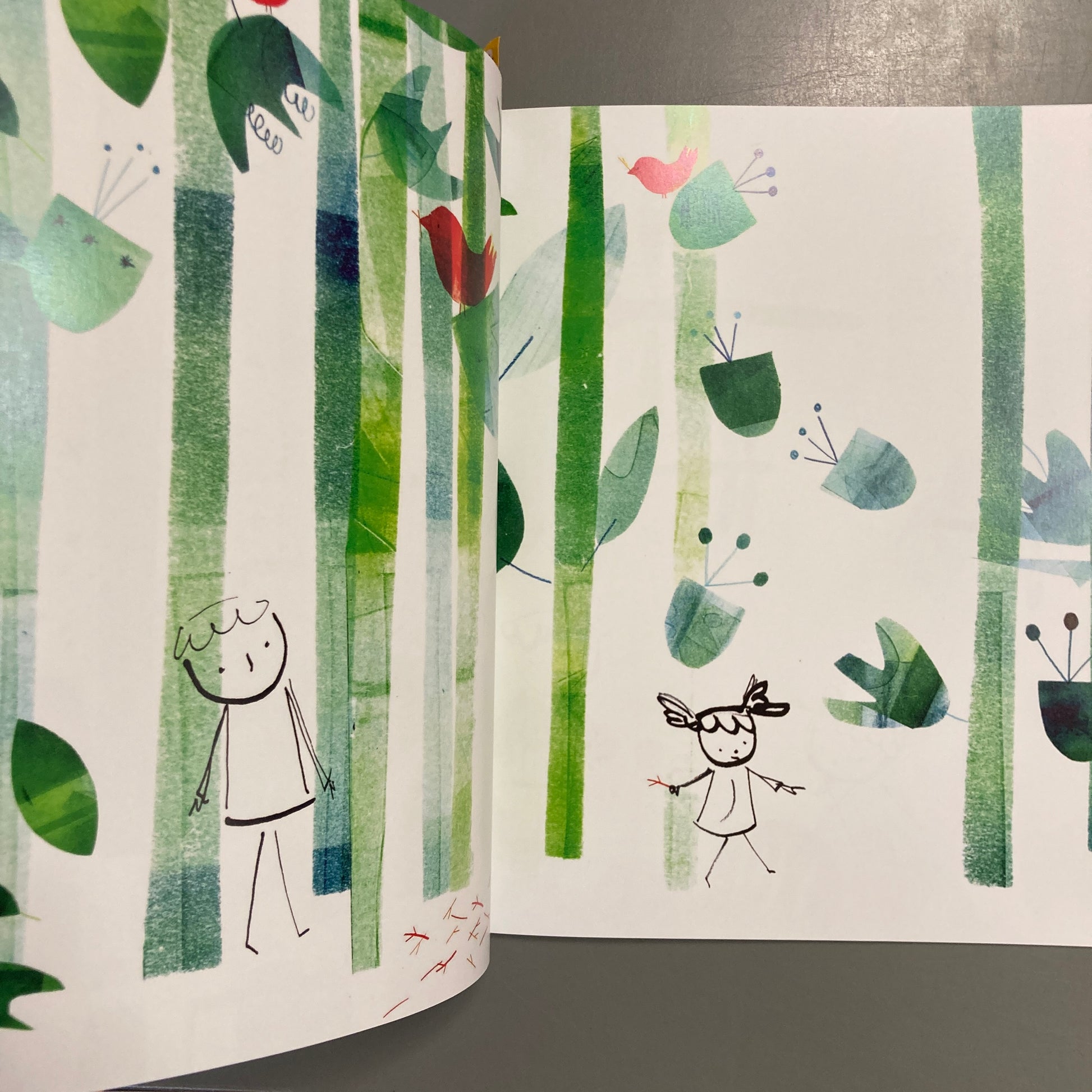 This is a wordless picture book or Silent Book which invites the reader to follow a young girl and her father on an adventure through the woods to the cool water’s edge. There’s lots to spot and discuss, from dragonflies and exotic birds overhead to turtles and colourful fish in the water.