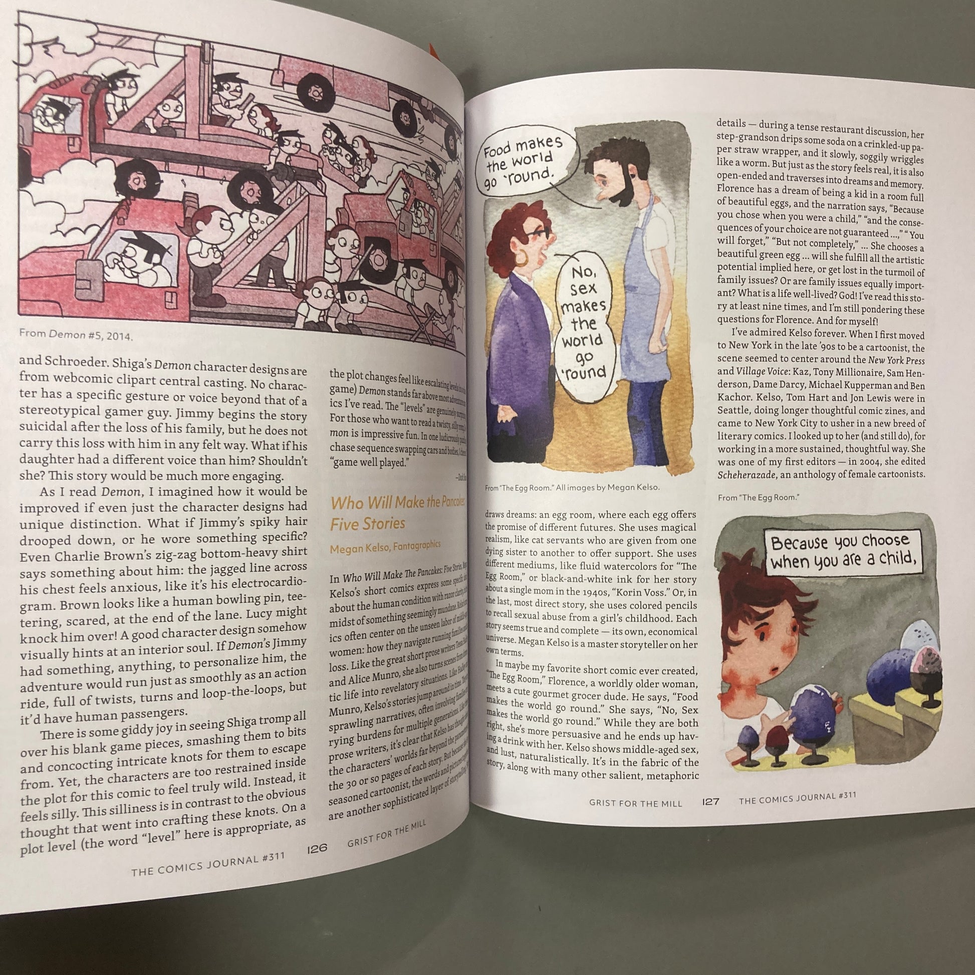Featured in this issue: An in-depth, personal conversation between Kate Beaton (Ducks: Two Years in the Oil Sands, Hark! A Vagrant) and Sarah Glidden (Rolling Blackouts), from the Pizza Island comics collective, about depicting history, humor, and social issues in comics form; a profile of Gilbert Shelton (Zap, Fabulous Furry Freak Bros.), which includes a never-before-published-in-English “Shelton Hagiography” by French cartoonist Pic; and an interview with musician and cartoonist Jeffrey Lewis (12 Crass Songs, Fuff). Plus: “An Imaginary Publication Cover Gallery” by Marc Bell (Hot Potatoe); a new manga column that puts classic and contemporary manga (Kamen Rider and Hunter X Hunter) in concert; a publishing roundtable on how to grow the adult audience for comics; a deep dive into an underdiscussed Charlton cartoonist, Enrique Nieto; a case for fine artist Dorothy Iannone’s work as comics, and much more.
