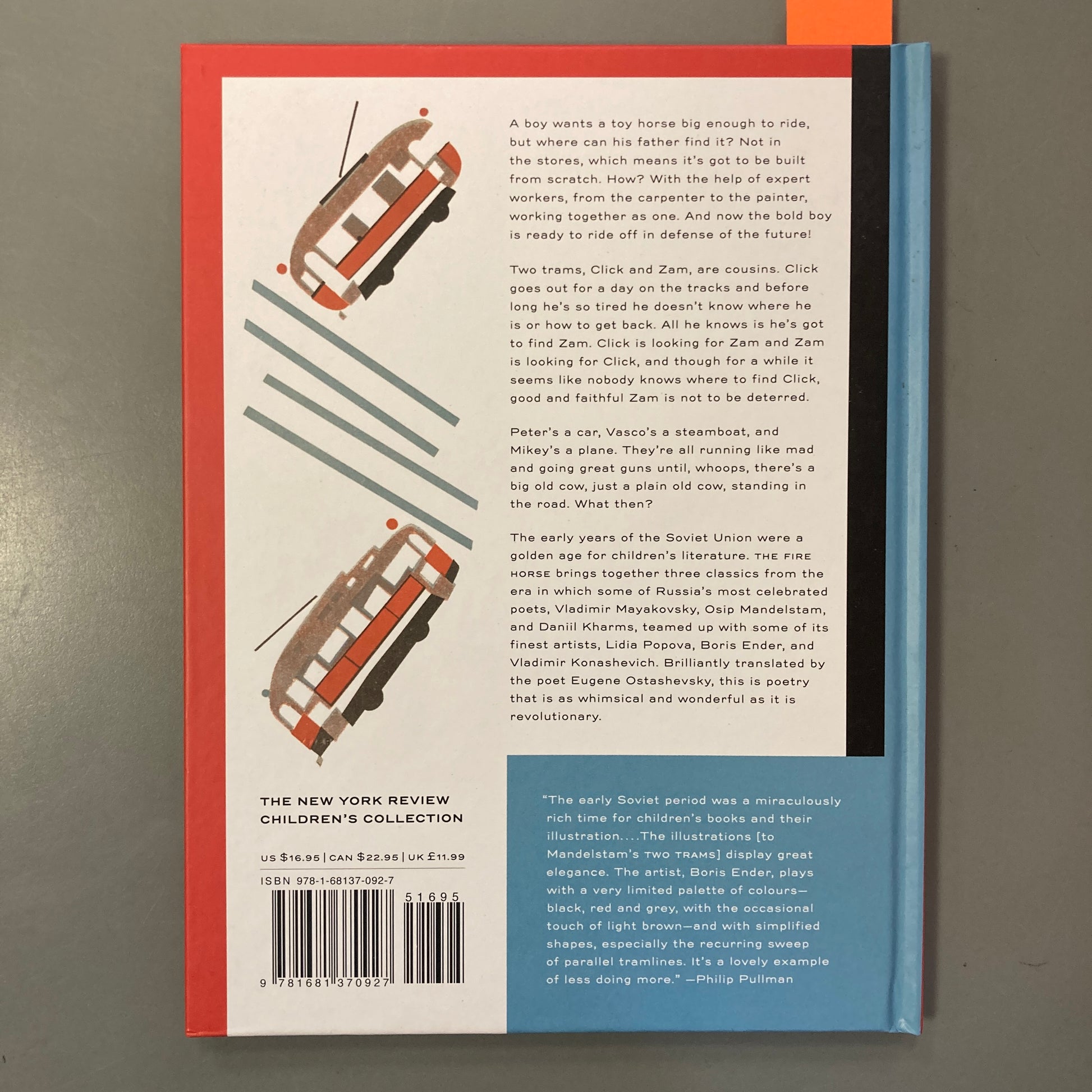Peter’s a car, Vasco’s a steamboat, and Mikey’s a plane. They’re all running like mad and going great guns until, whoops, there’s a big old cow, just a plain old cow, standing in the road. What then? The early years of the Soviet Union were a golden age for children’s literature. The Fire Horse brings together three classics from the era in which some of Russia’s most celebrated poets, Vladimir Mayakovsky, Osip Mandelstam, and Daniil Kharms, teamed up with some of its finest artists, Lidia Popova, Boris Ender, and Vladimir Konashevich. Brilliantly translated by the poet Eugene Ostashevsky, this is poetry that is as whimsical and wonderful as it is revolutionary.