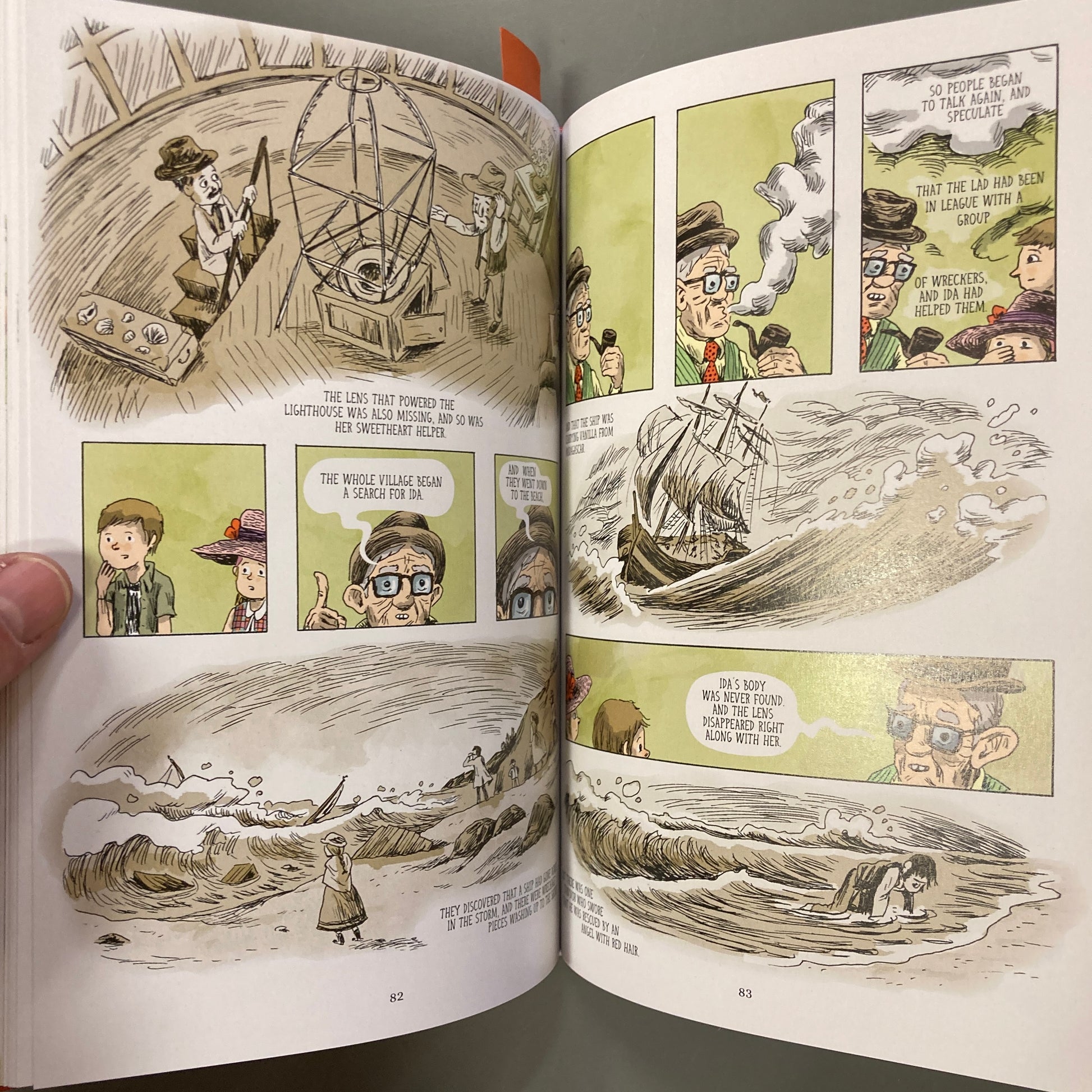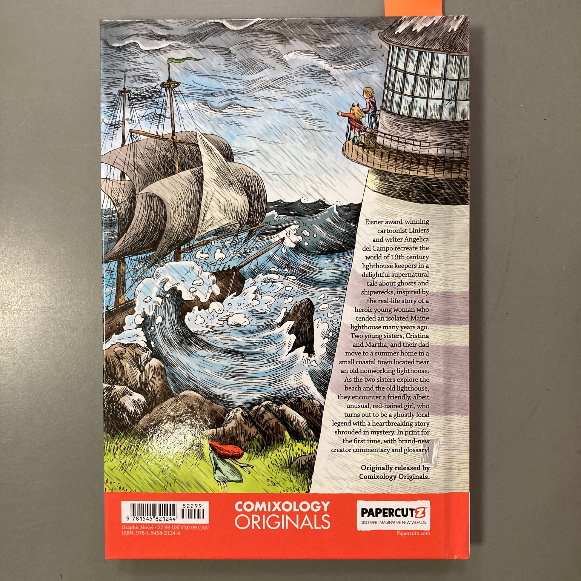 Eisner award-winning cartoonist Liniers and writer Angelica del Campo recreate the world of 19th century lighthouse keepers in a delightful supernatural tale about ghosts and shipwrecks, inspired by the real-life story of a heroic young woman who tended an isolated Maine lighthouse many years ago. Two young sisters Cristina and Martha and their dad, move to a summer home in a small coastal town located near an old nonworking lighthouse. As the two sisters explore the beach and the old lighthouse, they encounter a friendly, albeit unusual, red-haired girl, who turns out to be a ghostly local legend with a heartbreaking story shrouded in mystery.
