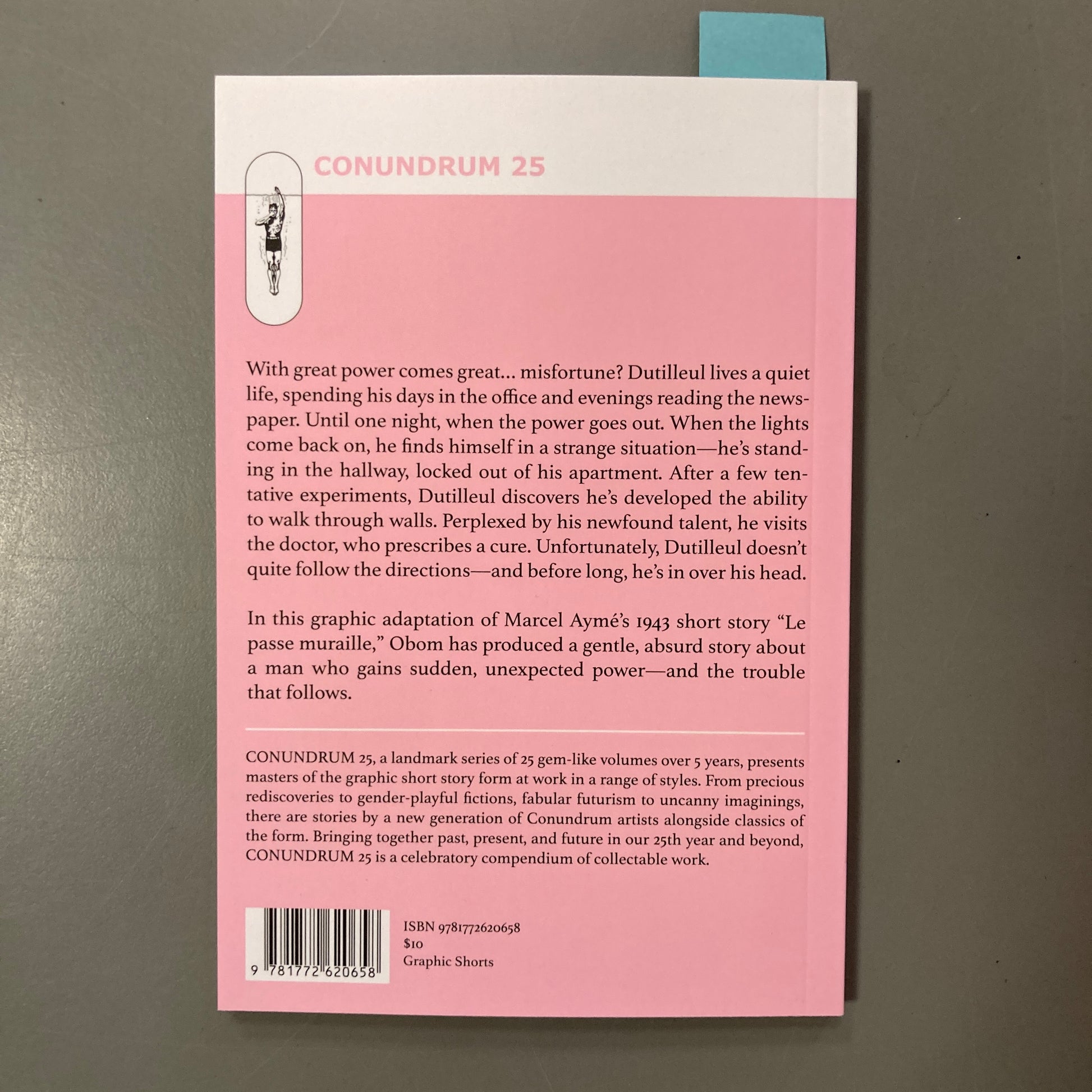 In this graphic adaptation of Marcel Aymé’s 1943 short story “Le passe muraille,” Obom has produced a gentle, absurd story about a man who gains sudden, unexpected power—and the trouble that follows.