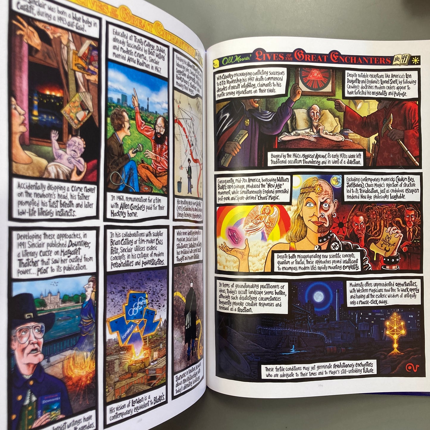 Also contained within this extravagant compendium of thaumaturgic lore is a history of magic from the last ice age to the present day, told in a series of easy-to-absorb pictorial biographies of fifty great enchanters and complemented by a variety of picture stories depicting events ranging from the Palaeolithic origins of art, magic, language, and consciousness to the rib-tickling comedy exploits of Moon and Serpent founder Alexander the False Prophet (“He’s fun, he’s fake, he’s got a talking snake!”).