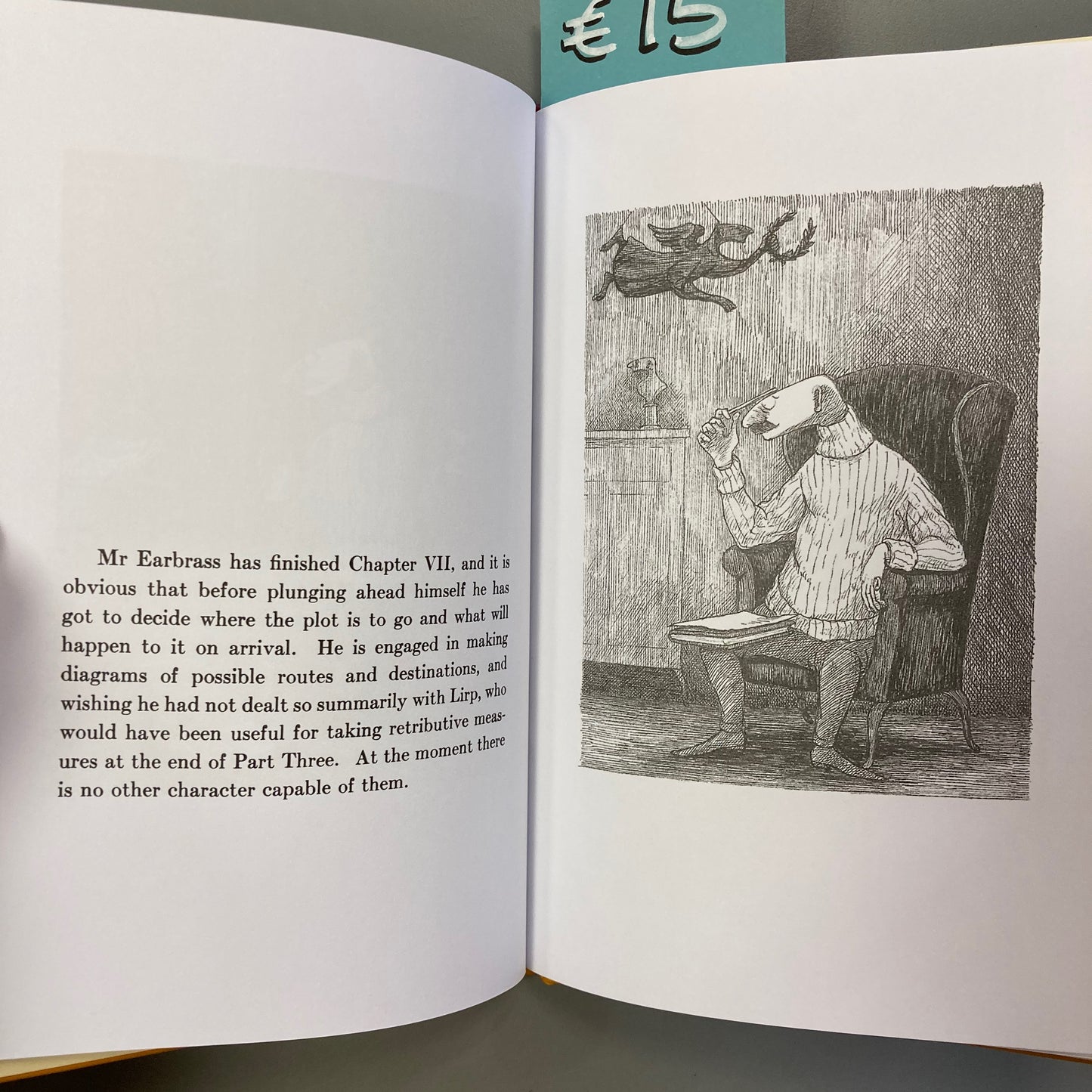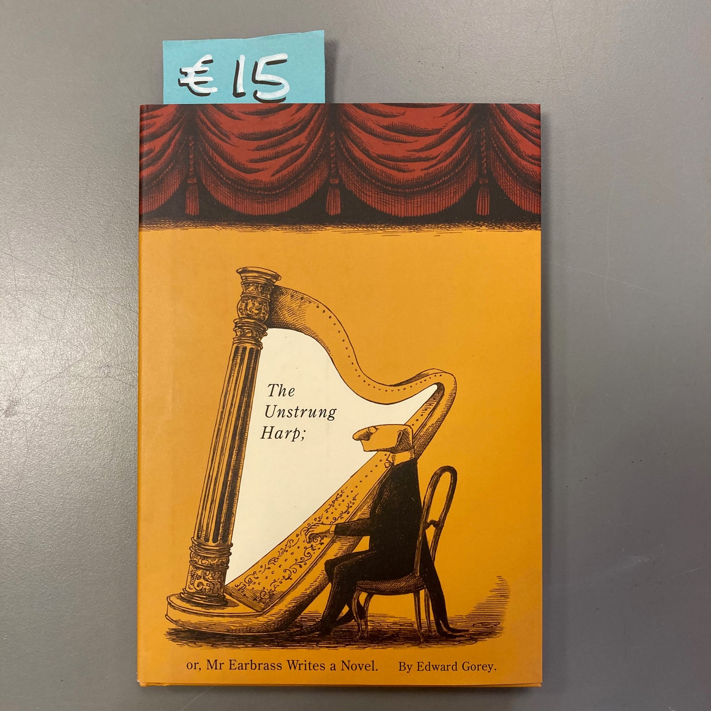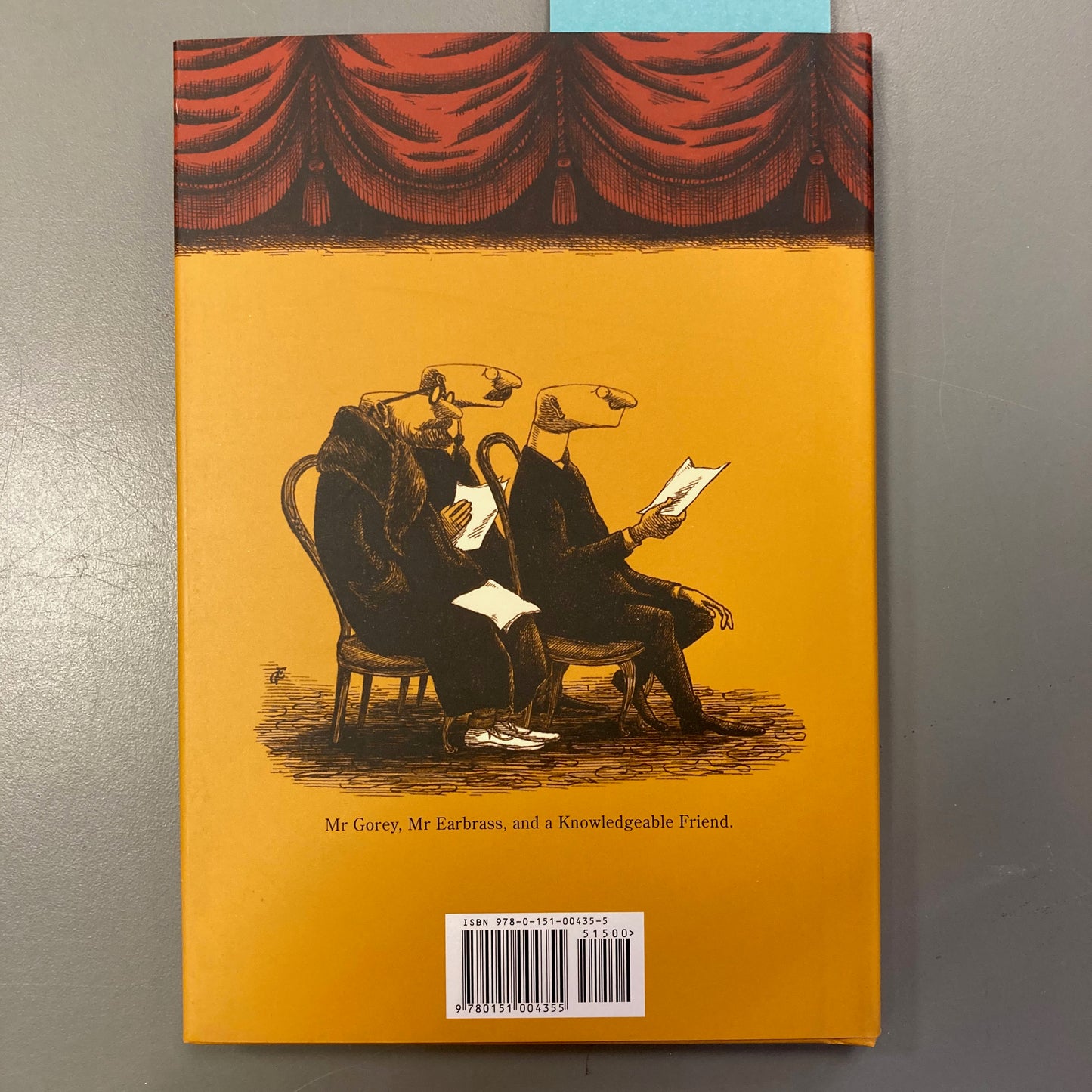 On November 18th of alternate years Mr. Earbrass begins writing his new novel. Weeks ago he chose its title at random from a list of them he keeps in a little green note-book. It being tea-time of the 17th, he is alarmed not to have thought of a plot to which The Unstrung Harp might apply, but his mind will keep reverting to the last biscuit on the plate. So begins what the Times Literary Supplement called "a small masterpiece." TUH is a look at the literary life and its "attendant woes: isolation, writer's block, professional jealousy, and plain boredom." But, as with all of Edward Gorey's books, TUH is also about life in general, with its anguish, turnips, conjunctions, illness, defeat, string, parties, no parties, urns, desuetude, disaffection, claws, loss, trebizond, napkins, shame, stones, distance, fever, antipodes, mush, glaciers, incoherence, labels, miasma, amputation, tides, deceit, mourning, elsewards. You get the point. Finally, TUH is about Edward Gorey the writer, about Edward Gorey writing The Unstrung Harp. It's a cracked mirror of a book, and it's dedicated to RDP or Real Dear Person.
