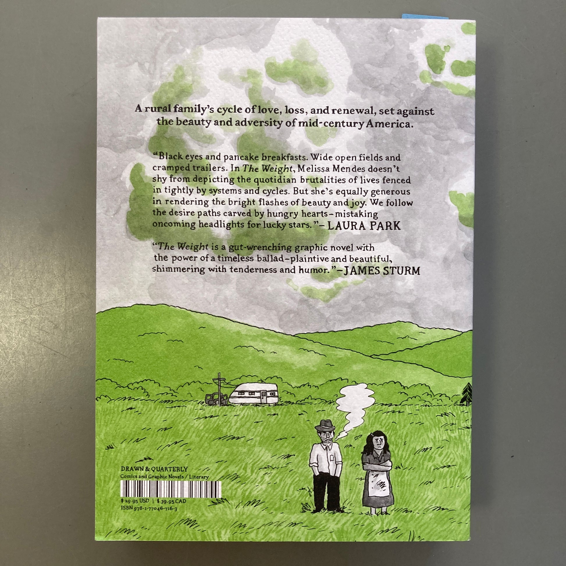 “Black eyes and pancake breakfasts. Wide open fields and cramped trailers. In The Weight, Melissa Mendes doesn’t shy from depicting the quotidian brutalities of lives fenced in tightly by systems and cycles. But she’s equally generous in rendering the bright flashes of beauty and joy. We follow the desire paths carved by hungry hearts—mistaking oncoming headlights for lucky stars.”—Laura Park