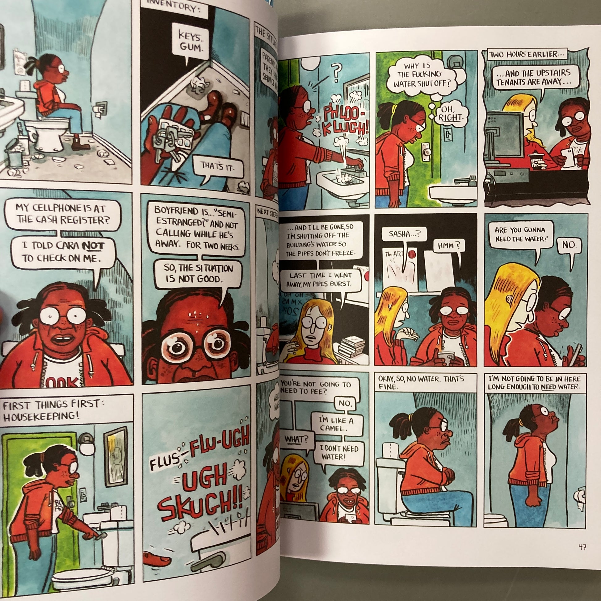 In “Nestled All Snug,” frazzled bookstore clerk Sasha prepares to close the store and head home to watch Hallmark Christmas specials after a fight with her boyfriend means she’s home alone for the holidays. Hmm, that stack of boxes outside the bathroom seems a little precarious. Maybe Sasha will do returns when she gets back to work post-holidays. FWUMP FWUMP FWUMP. Guess someone is going to regret leaving their phone by the register before going to the bathroom.
