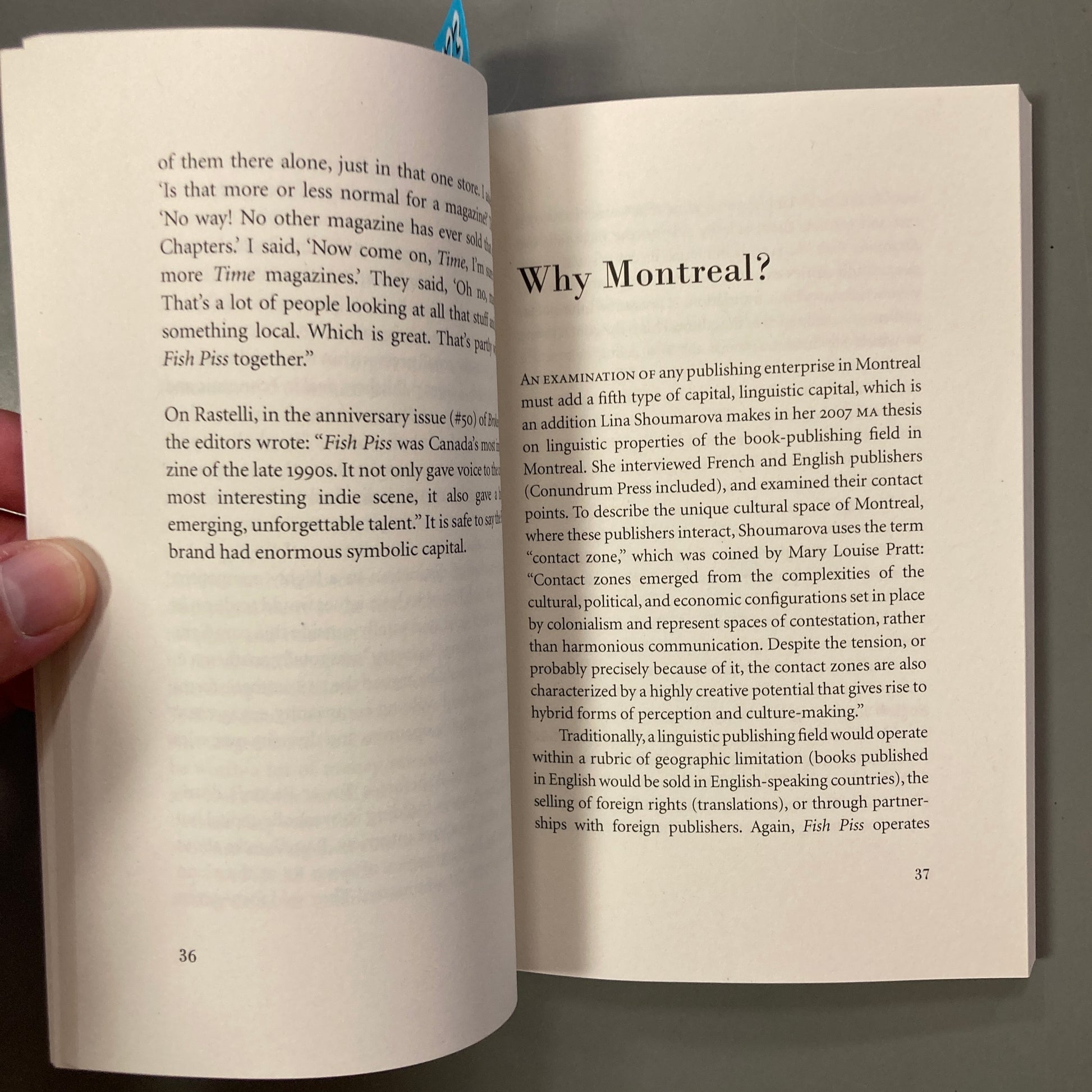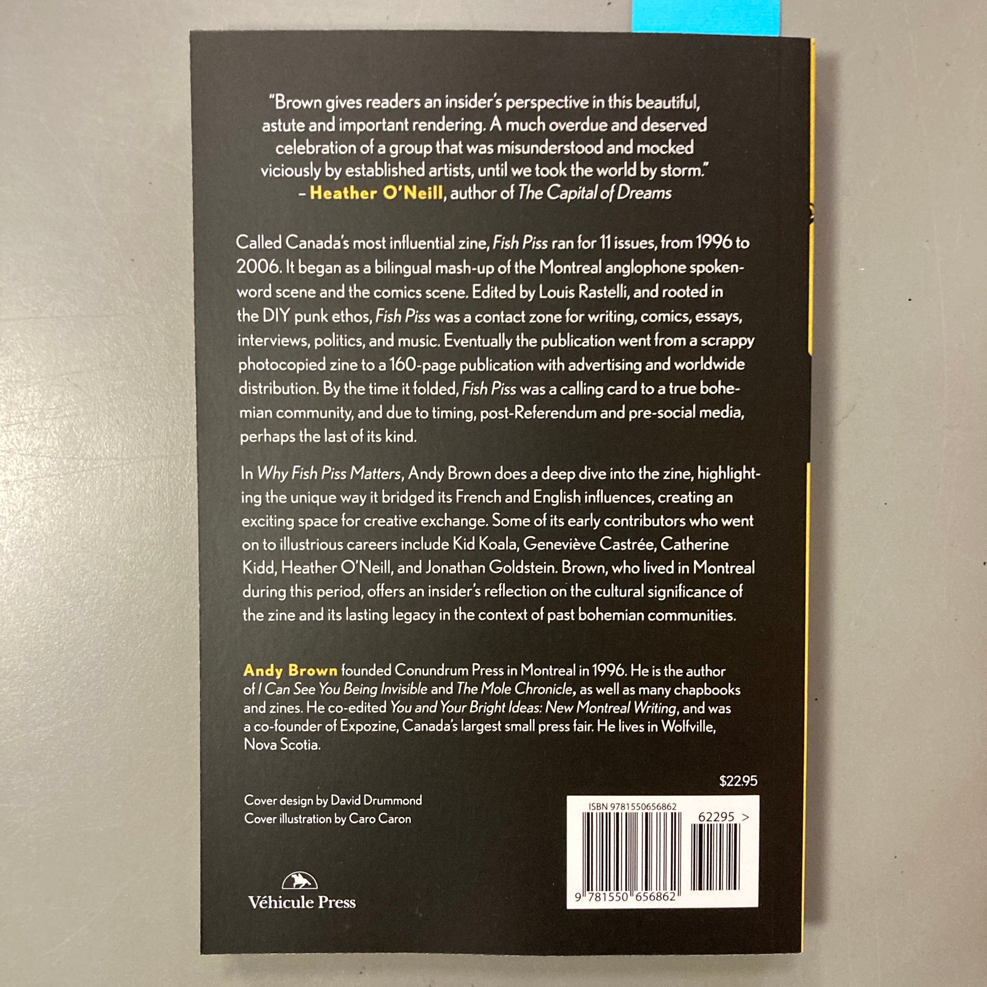 In Why Fish Piss Matters, Andy Brown does a deep dive into the zine, highlighting the unique way it bridged its French and English influences, creating an exciting space for creative exchange. Some of its early contributors who went on to illustrious careers include Kid Koala, Genevieve Castré e, Catherine Kidd, Heather O’ Neill, and Jonathan Goldstein. Brown, who lived in Montreal during this period, offers an insider's reflection on the cultural significance of the zine and its lasting legacy. He explores the history of various bohemian communities over the past 200 years, and Fish Piss’ s singular role in that history.